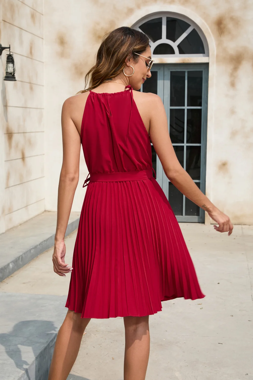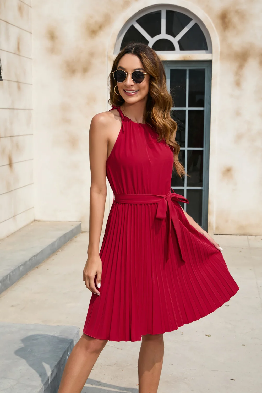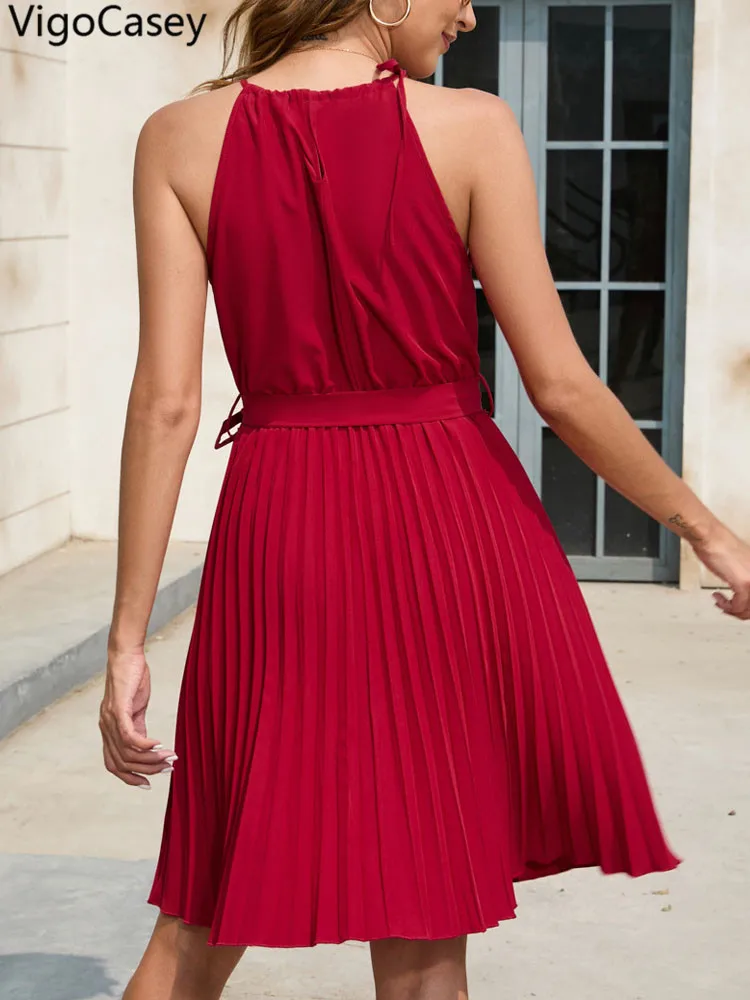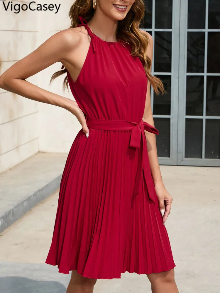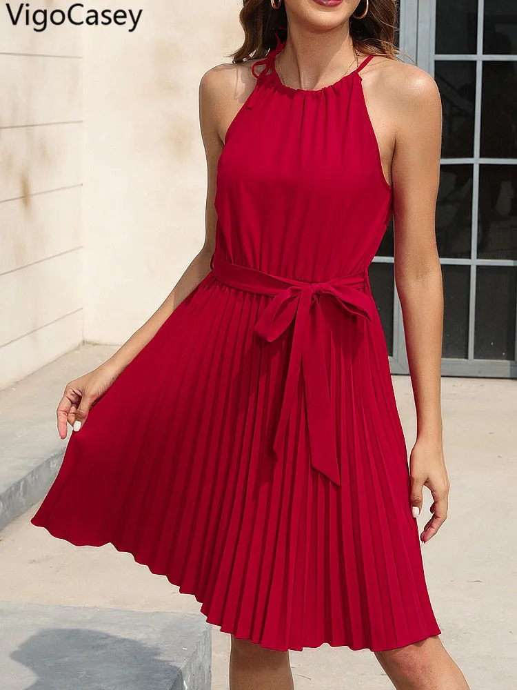 2025 Solid O-Neck Belted Evening Dress