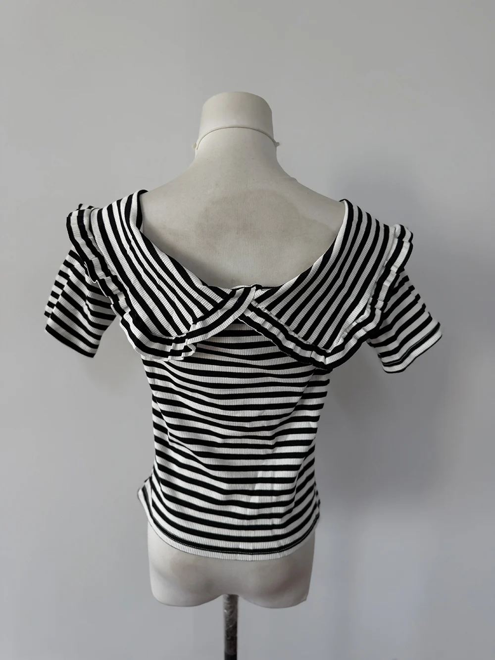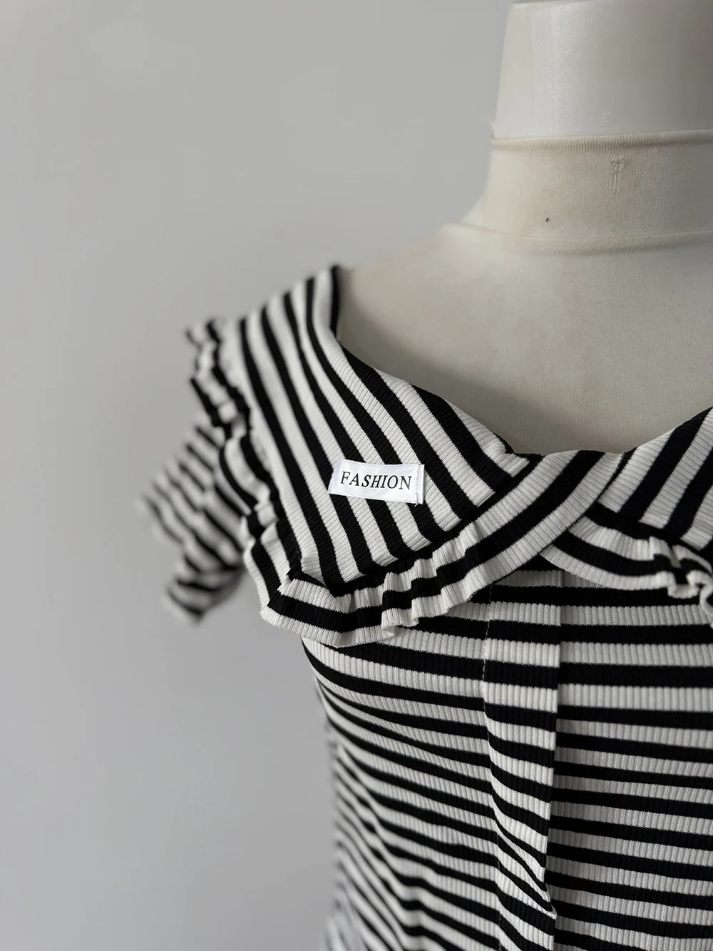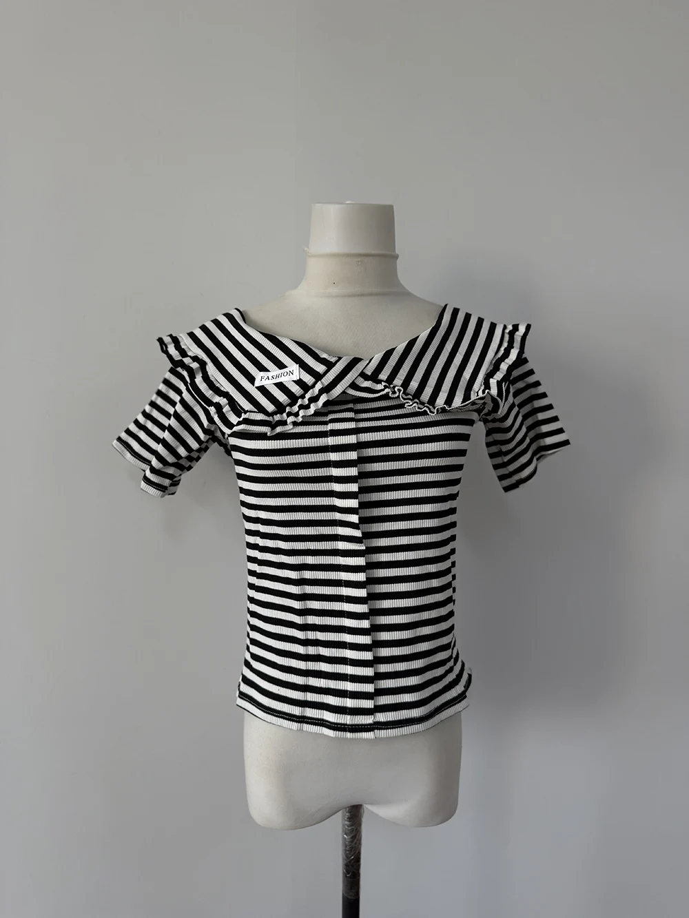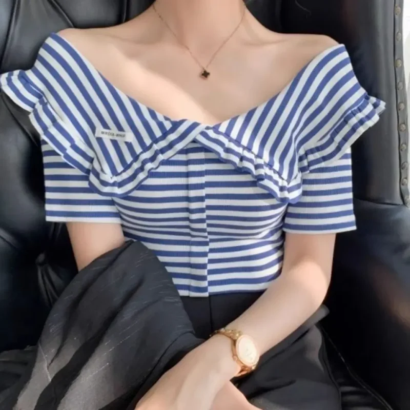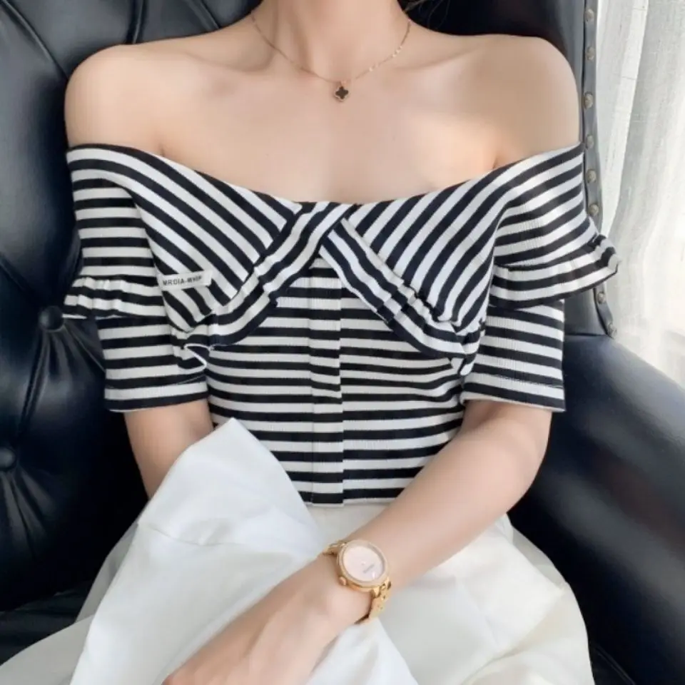 2025 Summer Korean Stripe Off Shoulder Short Sleeve T-Shirt
