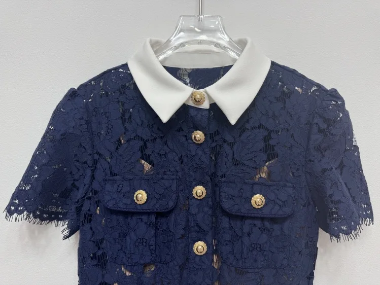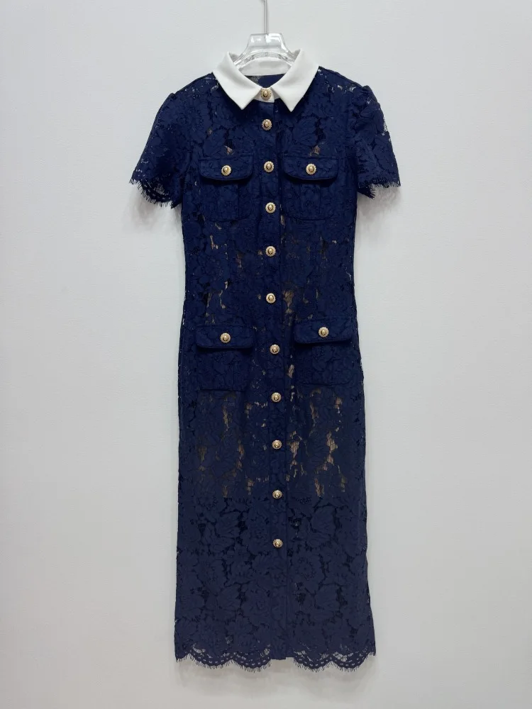 2025 Women’s Navy Lace Trim Midi Dress with Contrast Collar