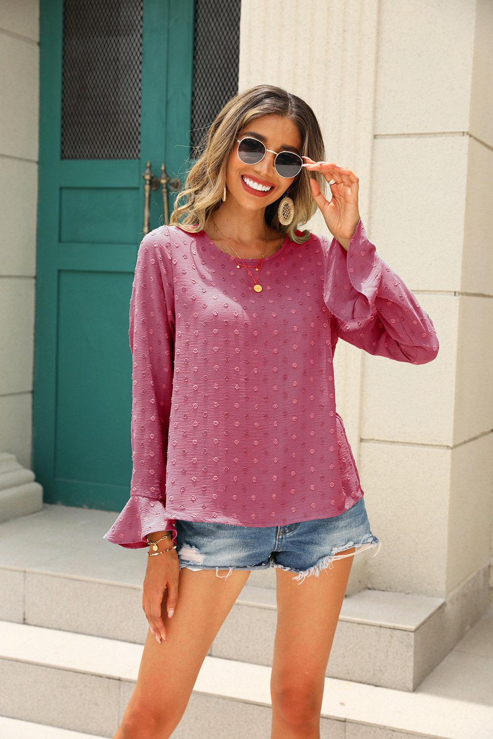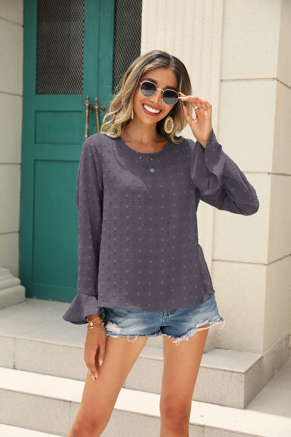 Autumn New Pullover round-Neck Flared Sleeves Jacquard Wave Point Office Women Shirt