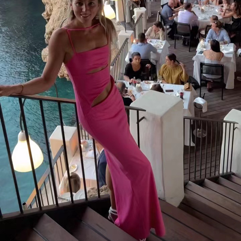 Autumn Popular Hollow Out Cutout Backless Solid Color Cami Dress Split Dress Women