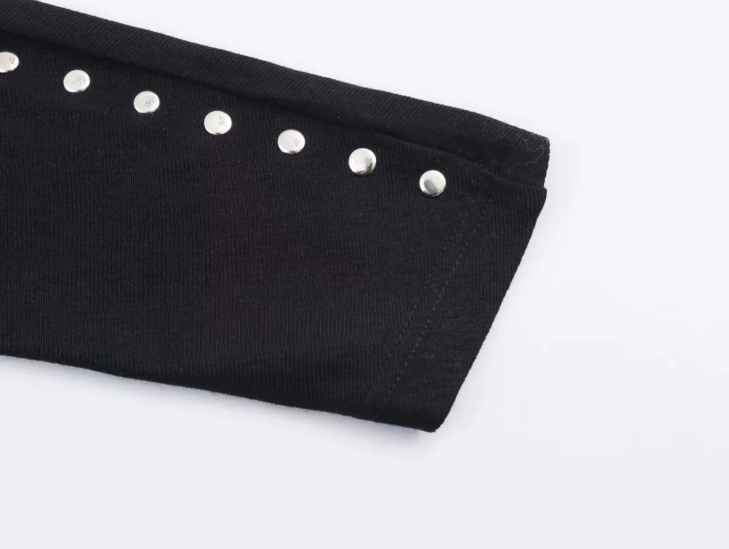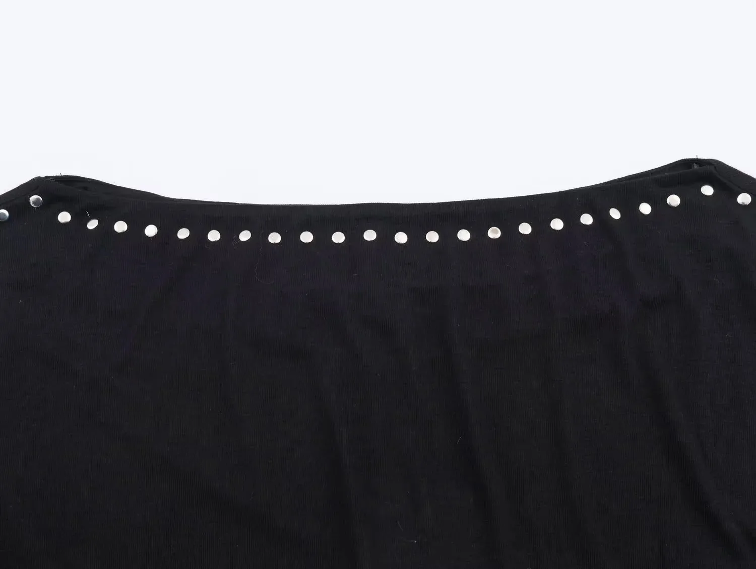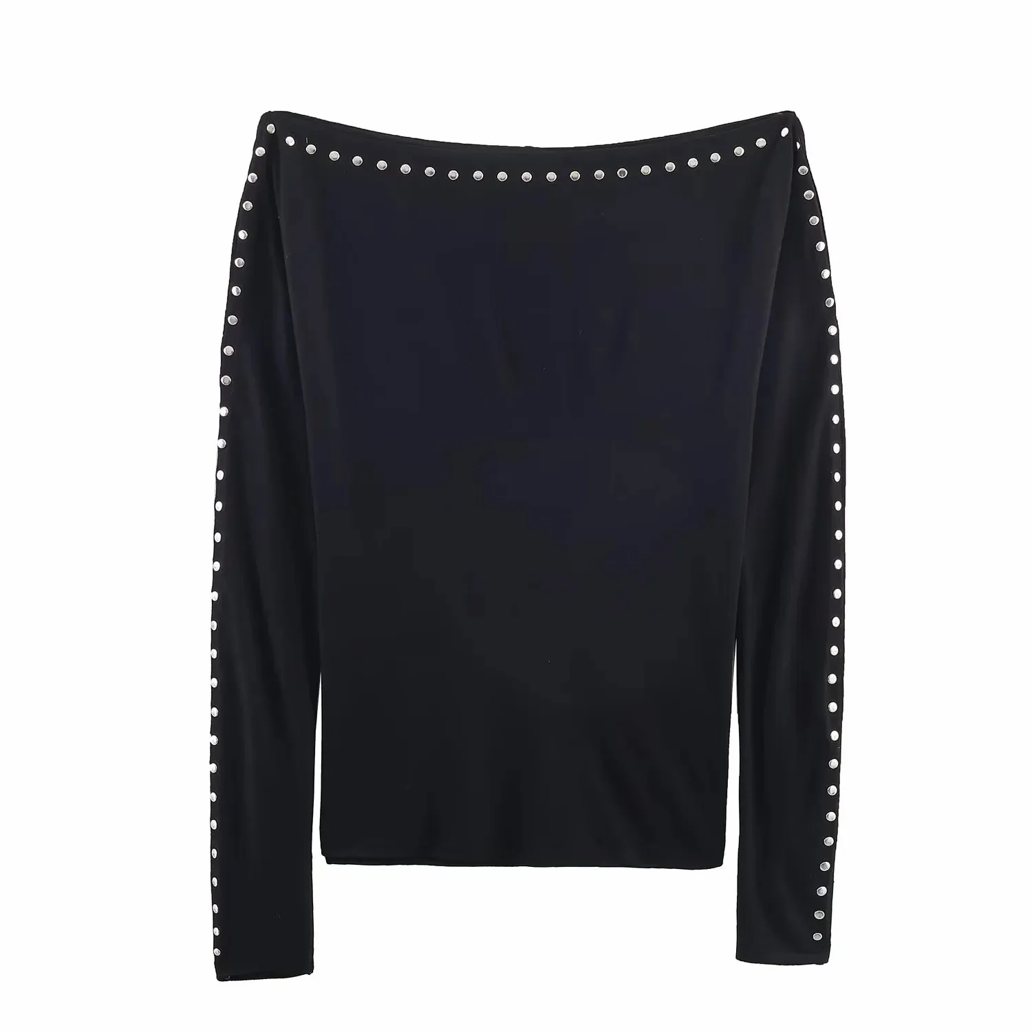 Autumn Winter Black Off Shoulder Rivet T Shirt for Women