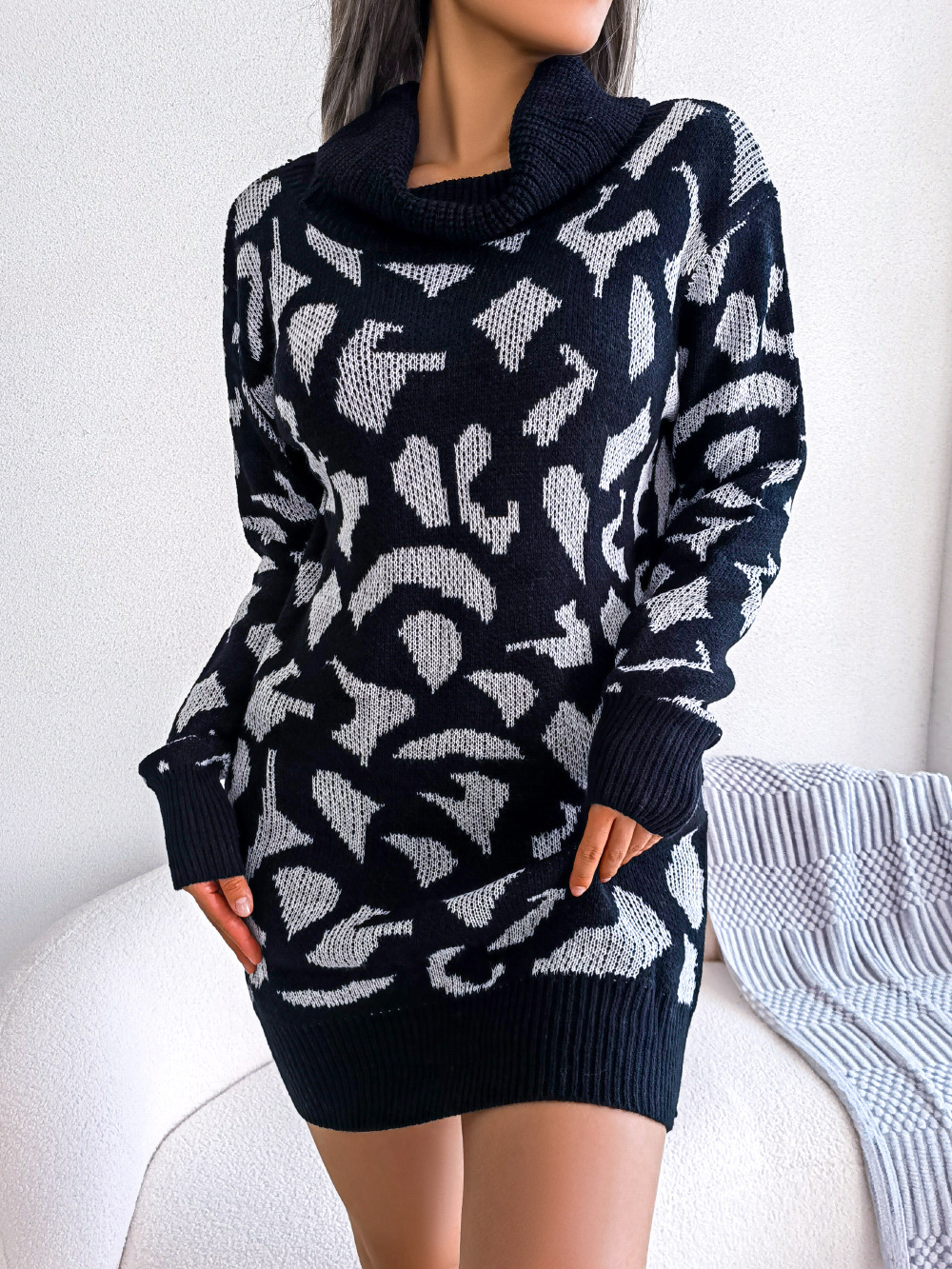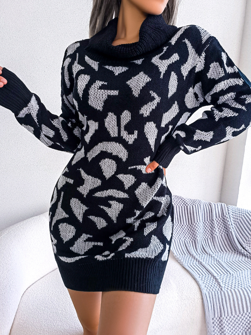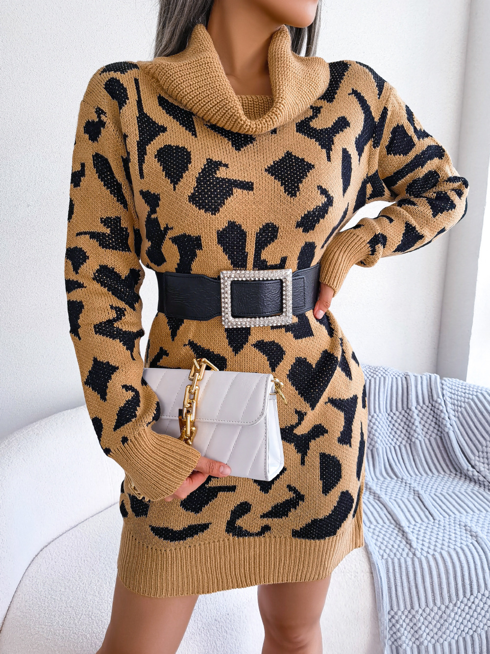 Autumn Winter Street Turtleneck Leopard Print Long Sleeve Base Sweater Dress Women Clothing