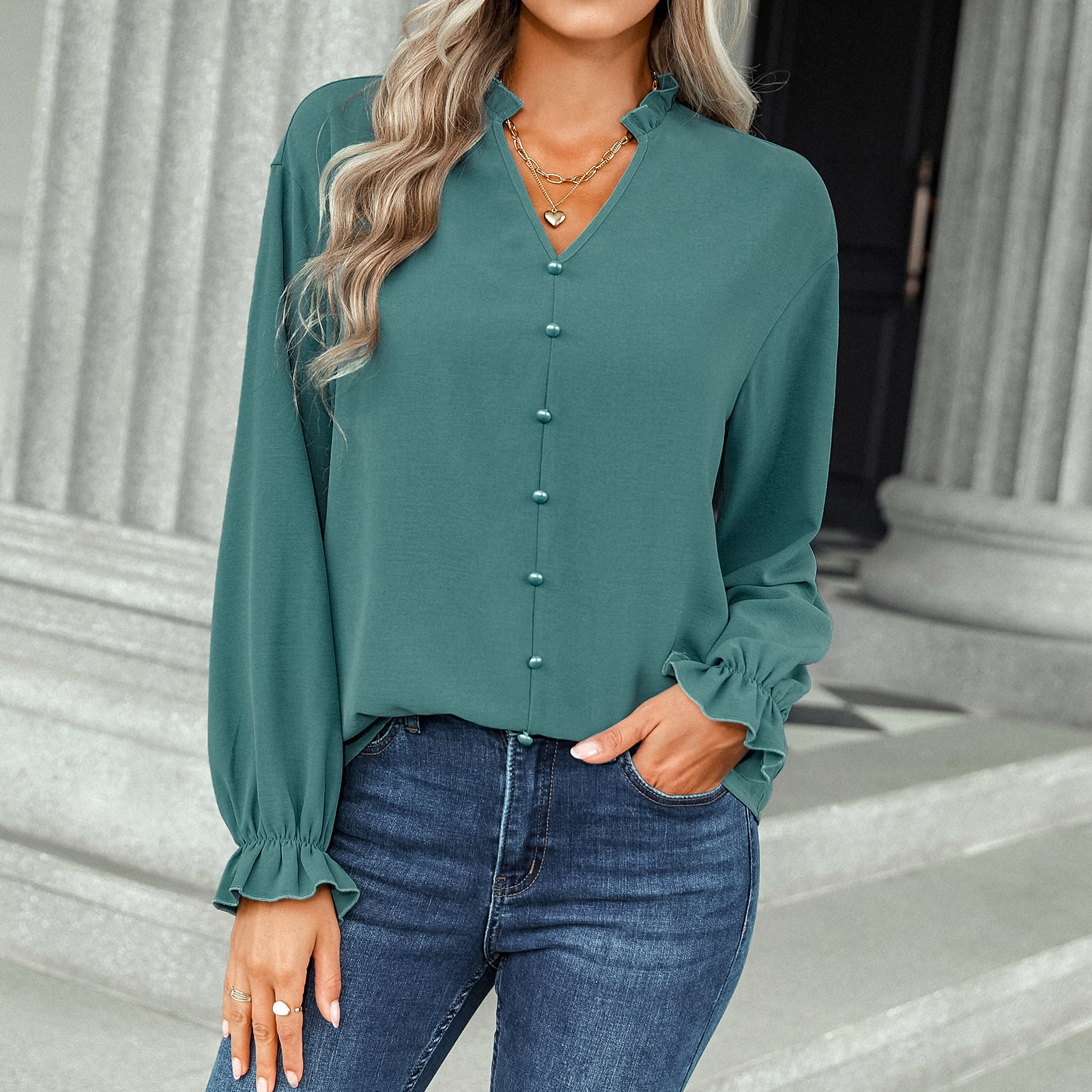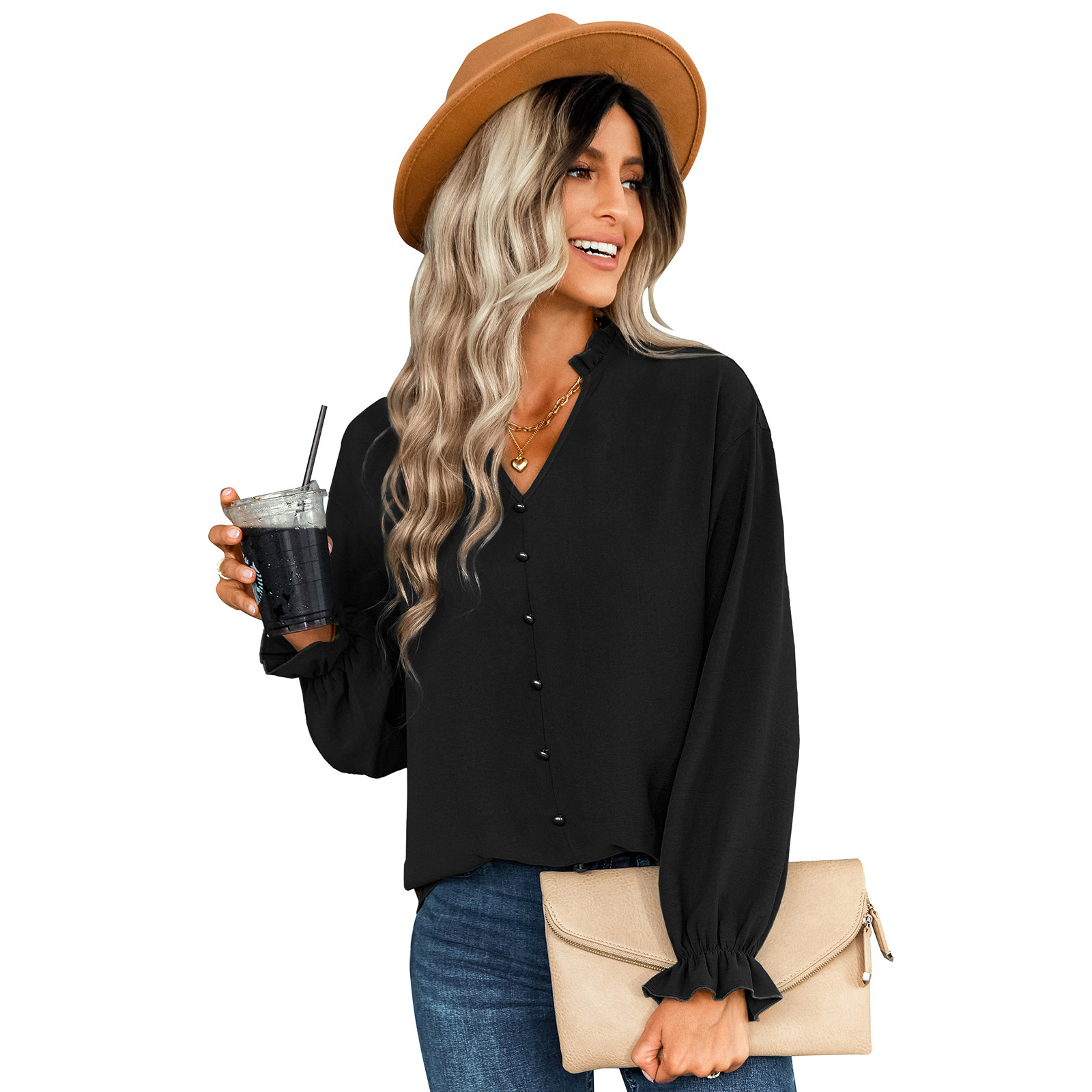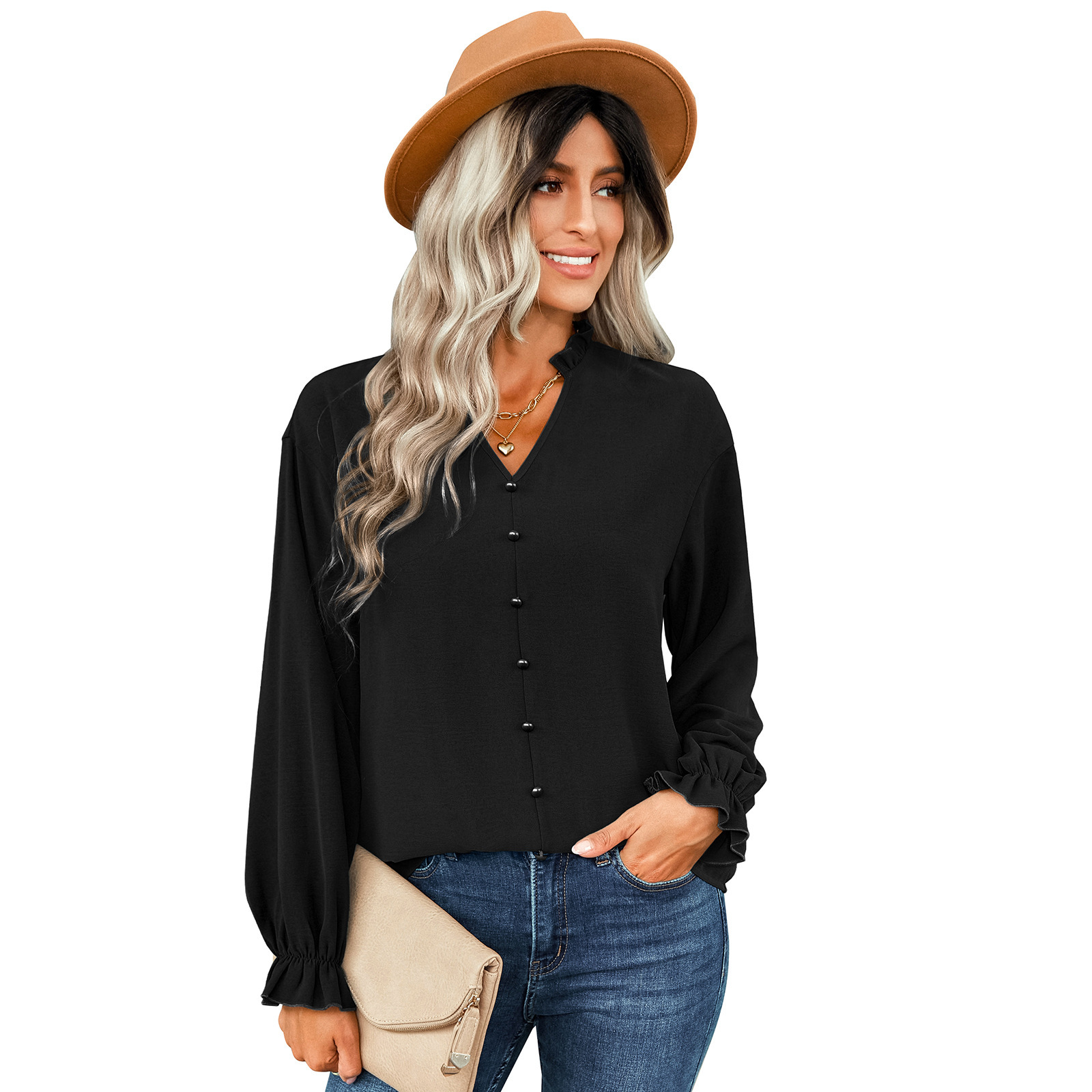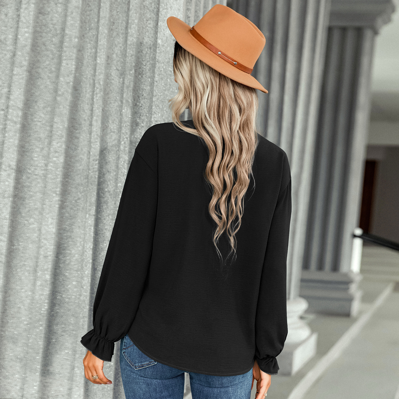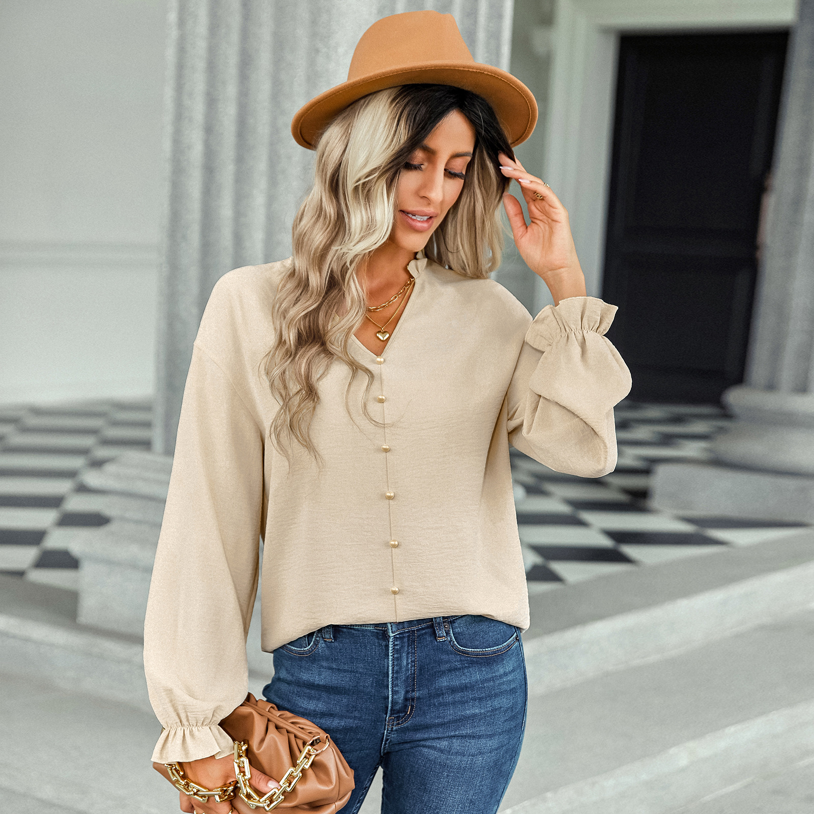 Autumn Winter V-neck Top Women Fastener Decoration Solid Color Shirt