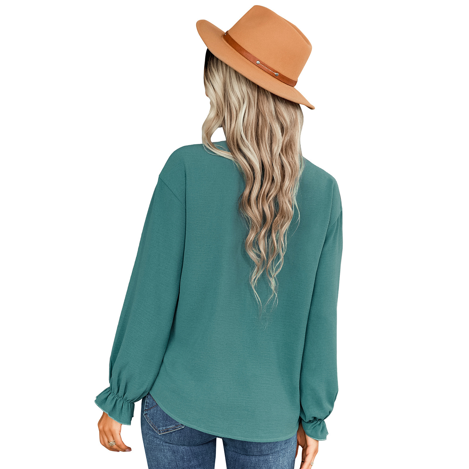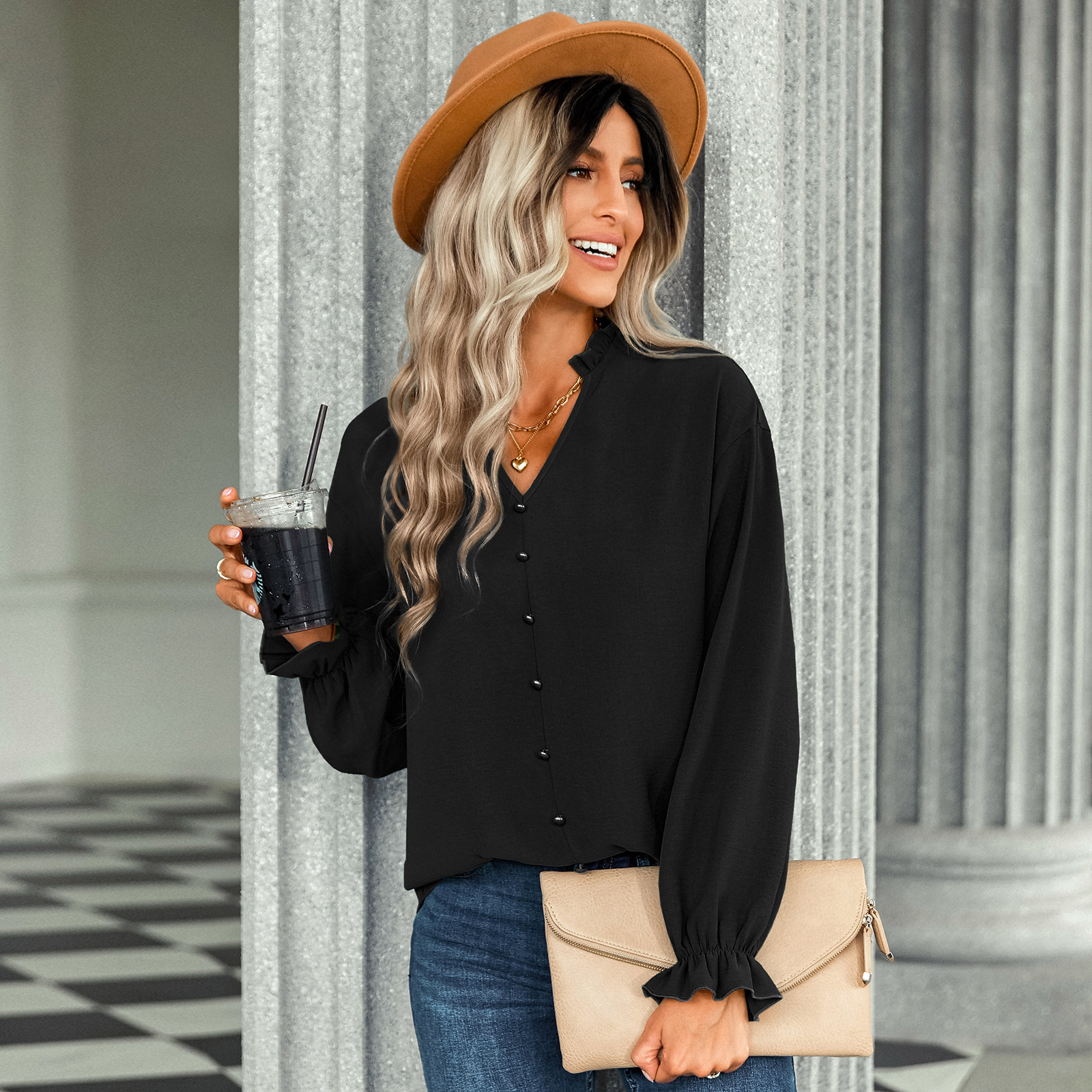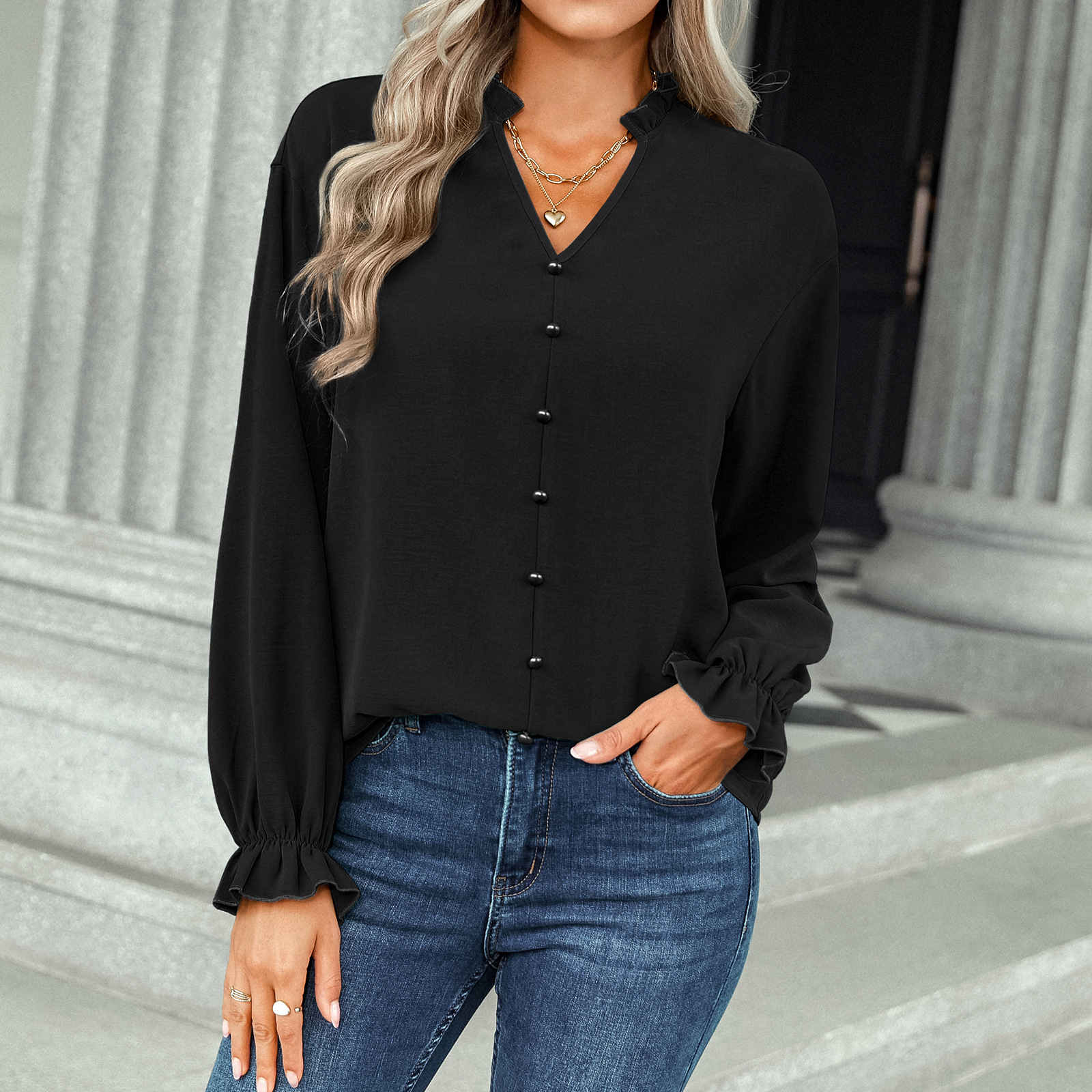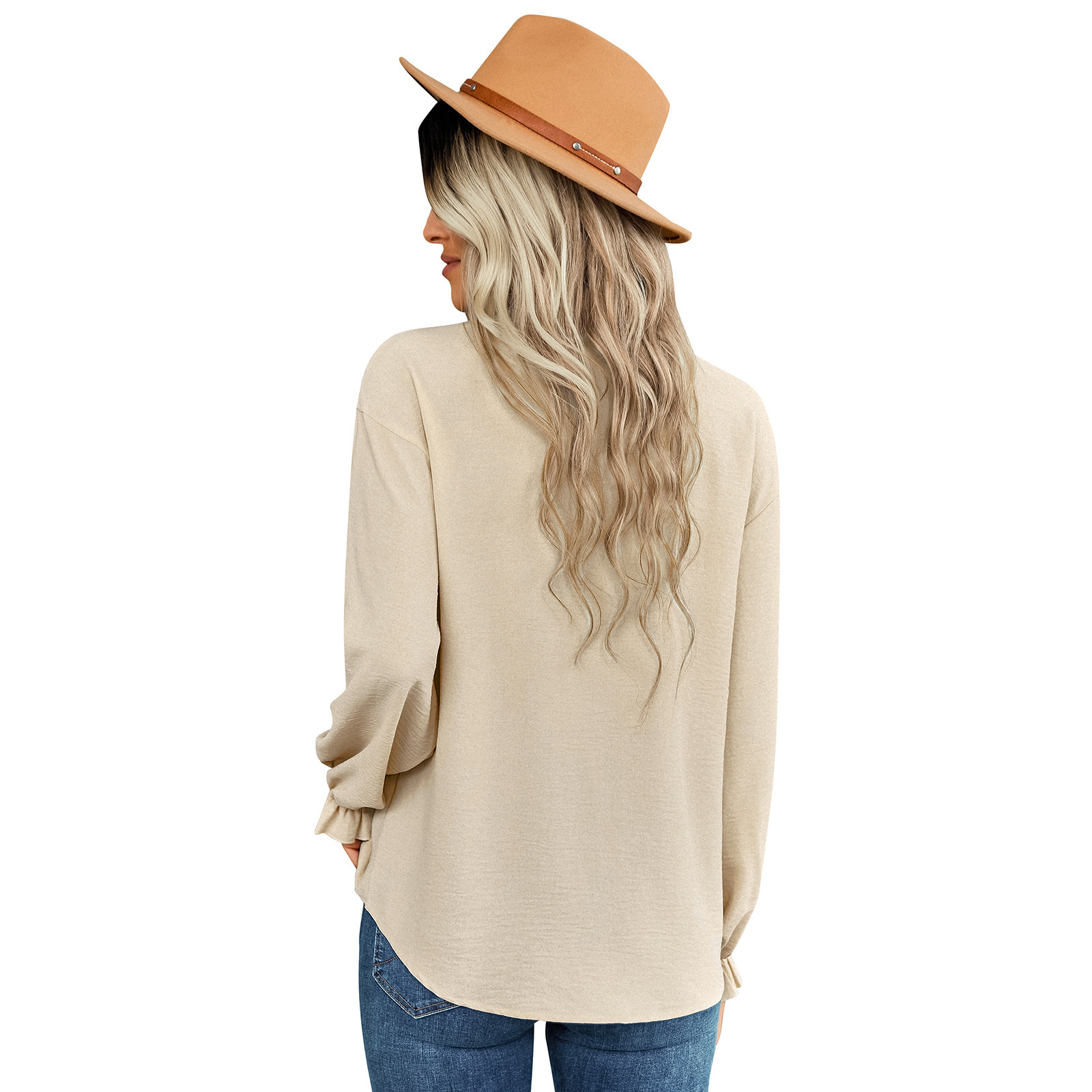Autumn Winter V-neck Top Women Fastener Decoration Solid Color Shirt