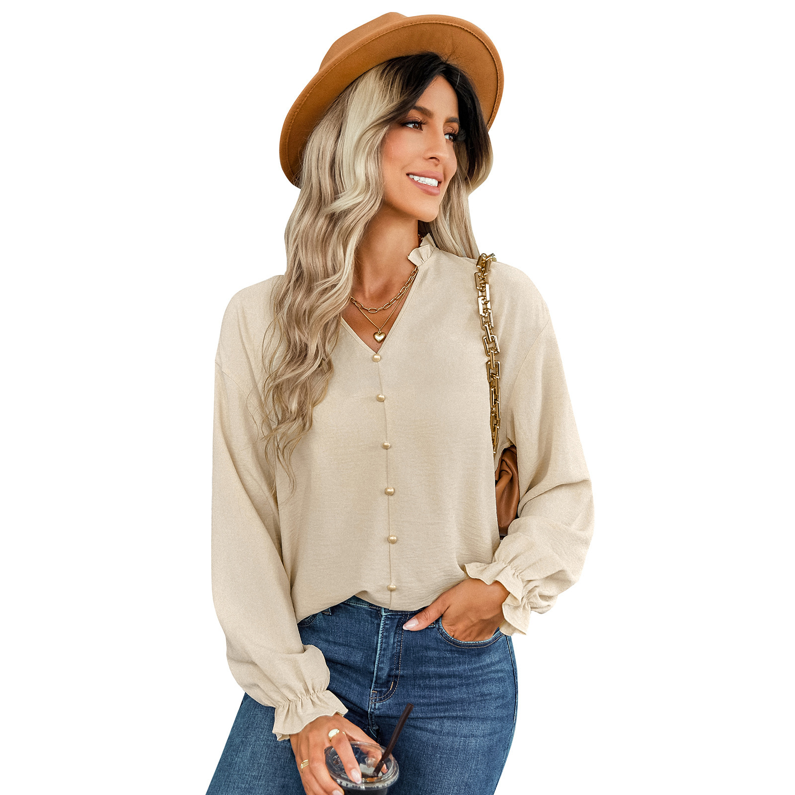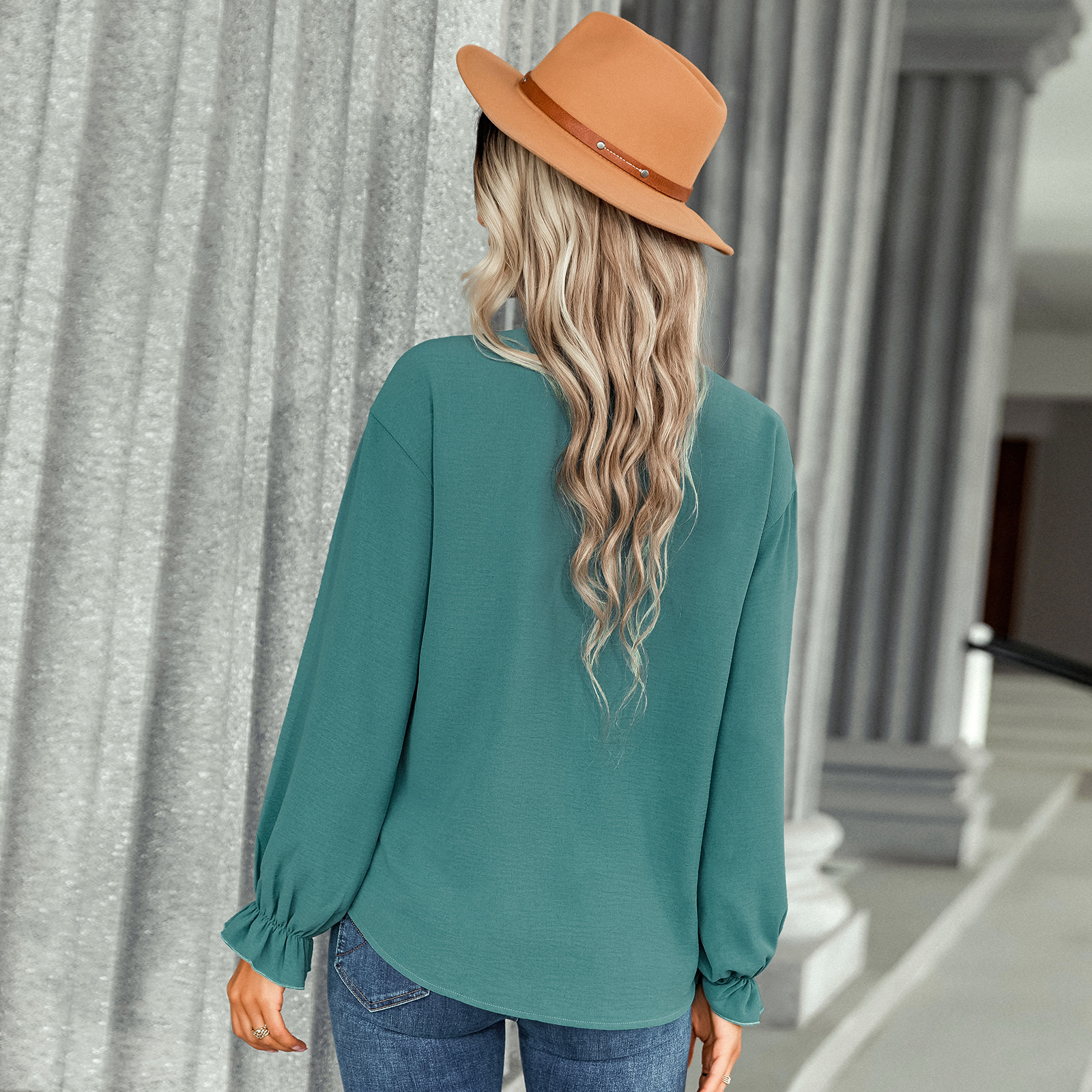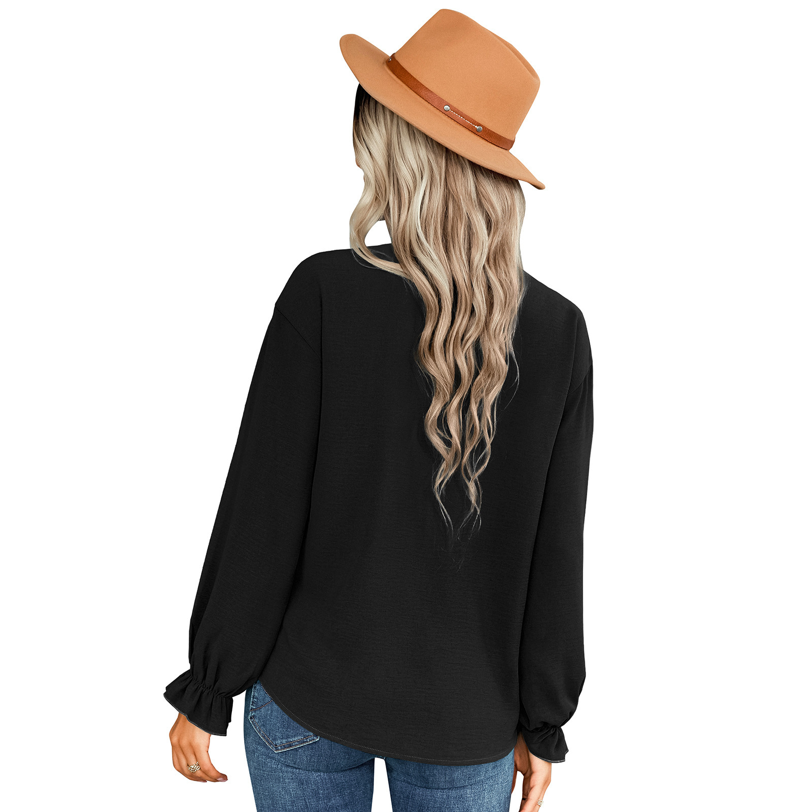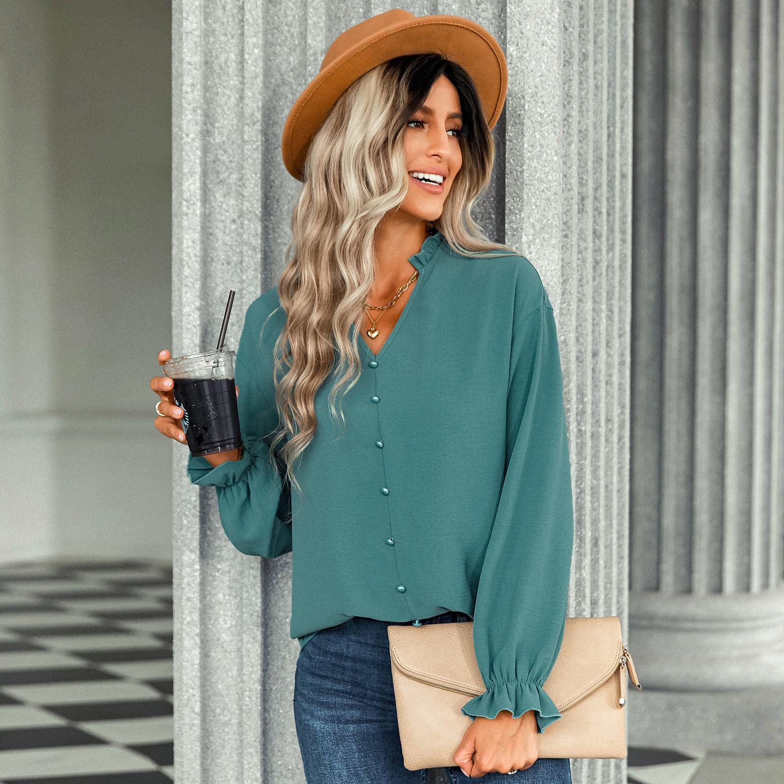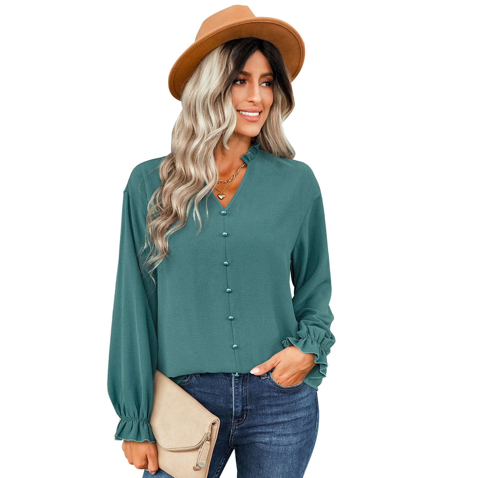 Autumn Winter V-neck Top Women Fastener Decoration Solid Color Shirt