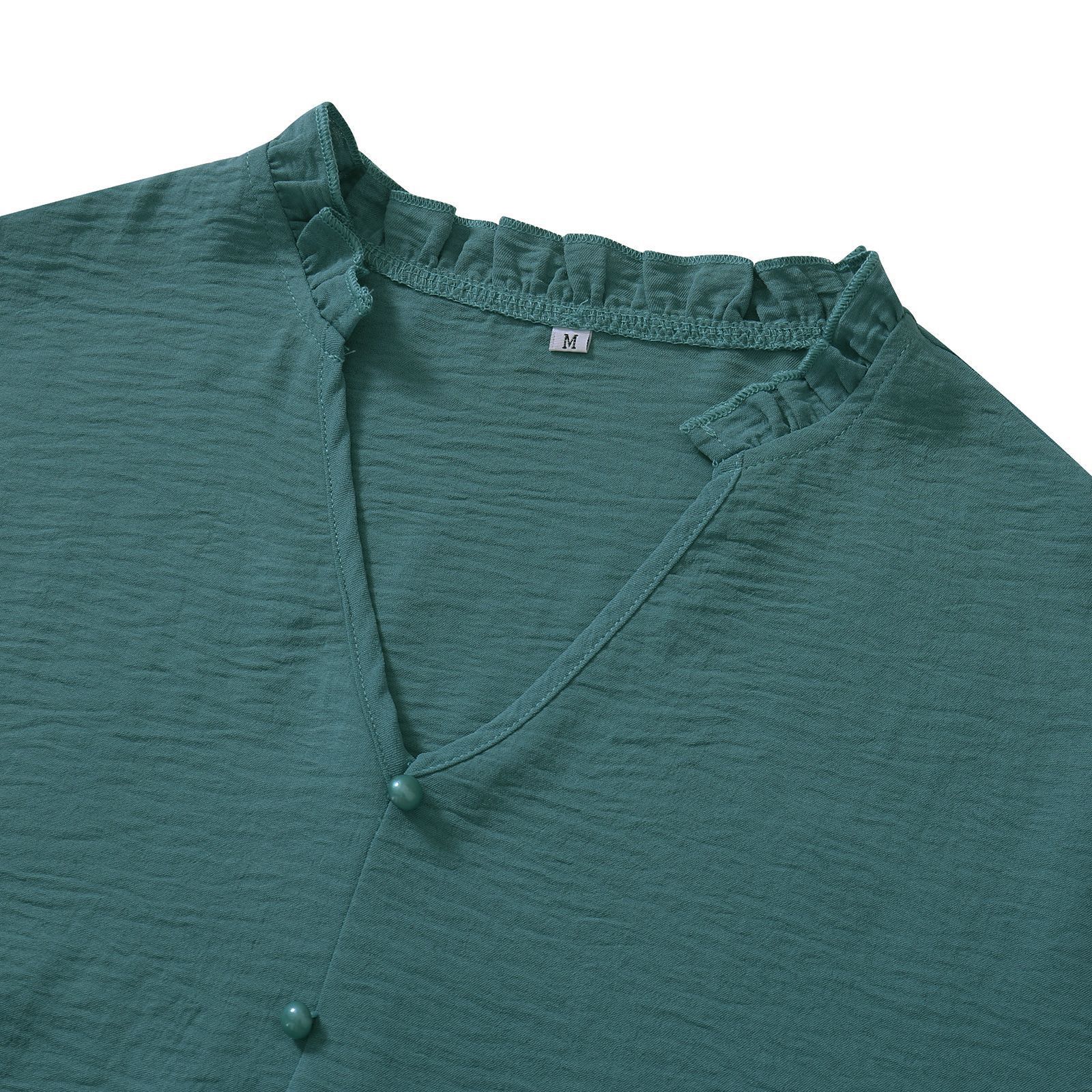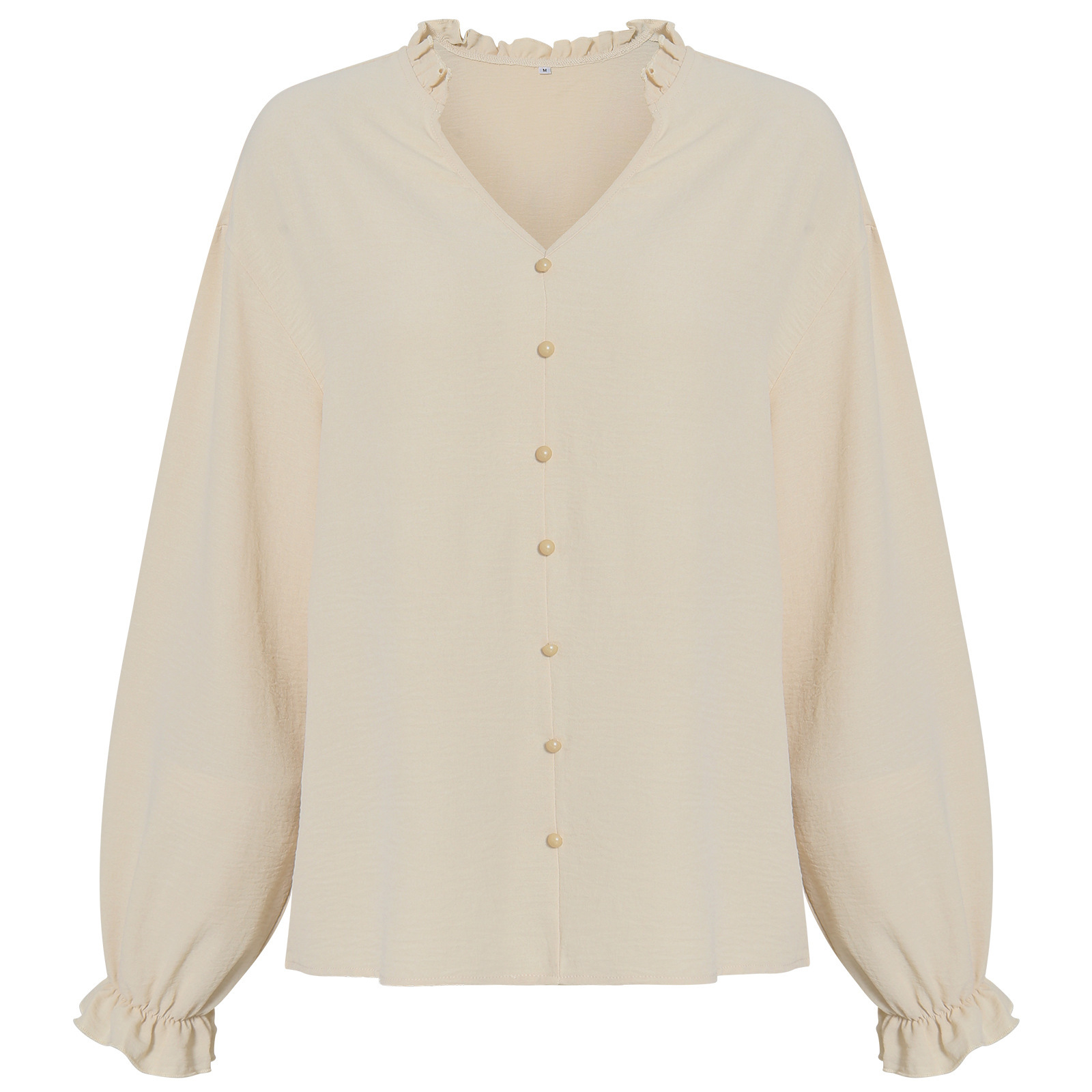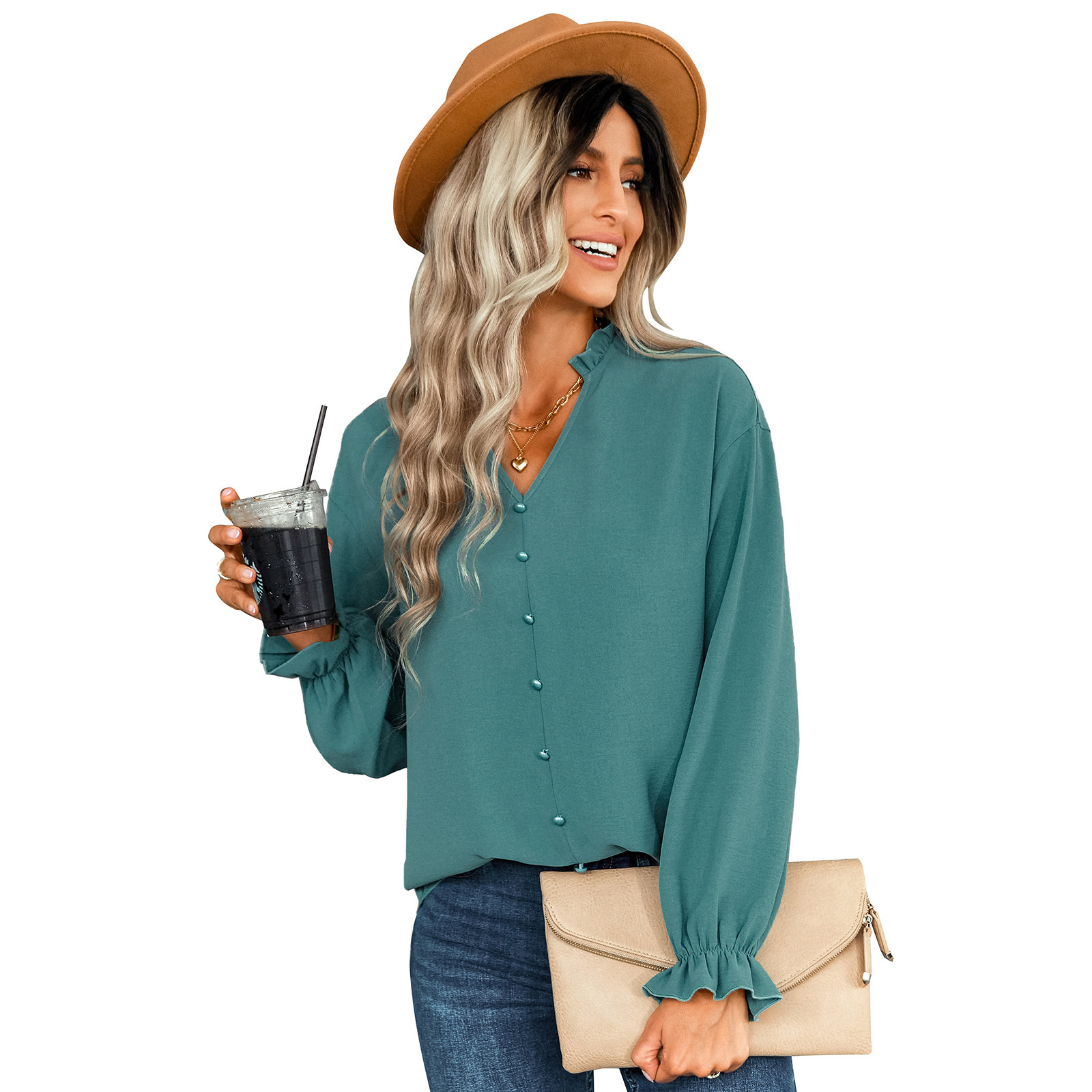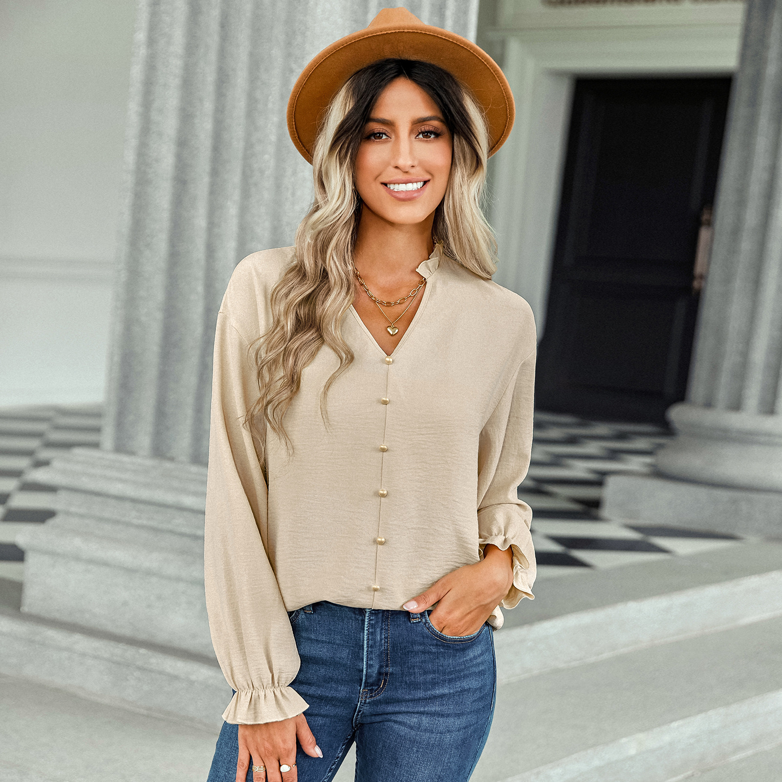 Be the first to review “Autumn Winter V-neck Top Women Fastener Decoration Solid Color Shirt”
