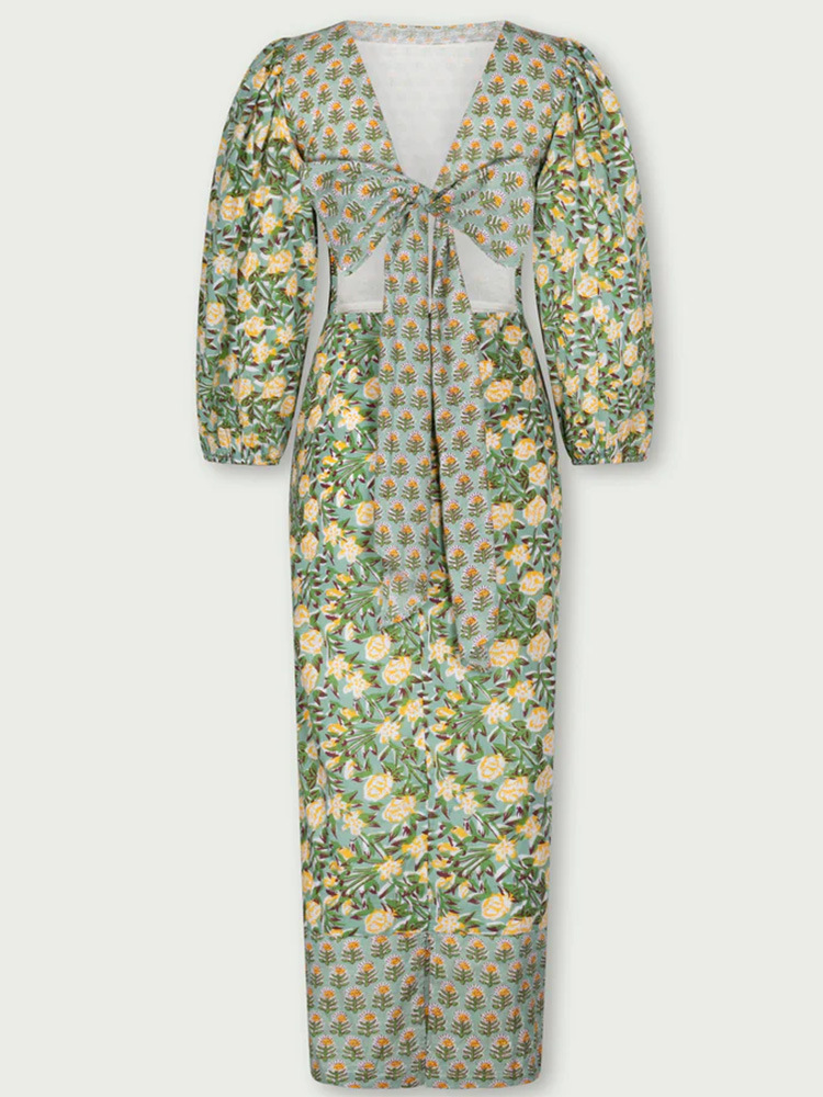 Backless Floral Contrast Color Lantern Sleeve Dress