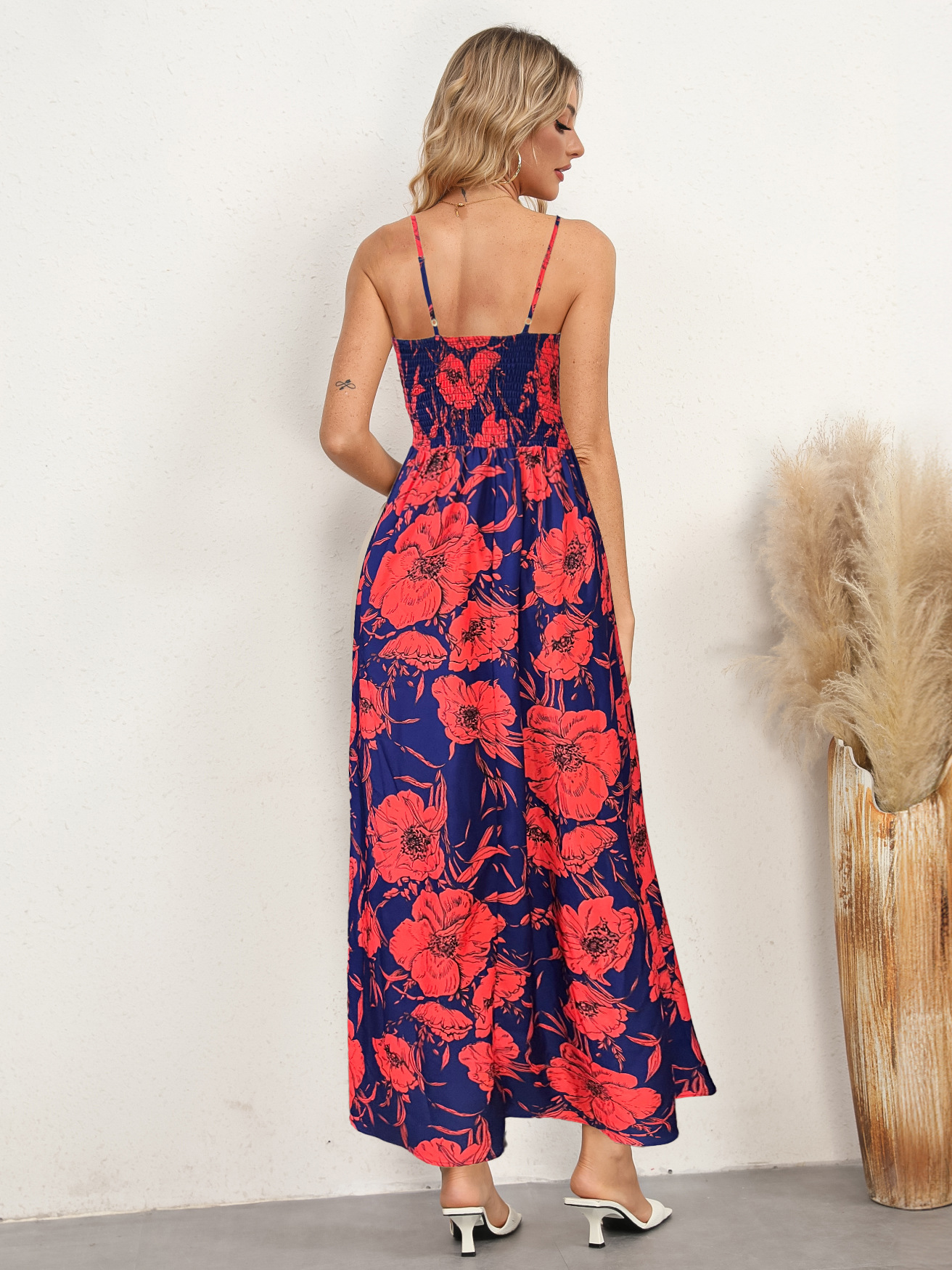 Backless Printed High Waist Suspender Long Dress