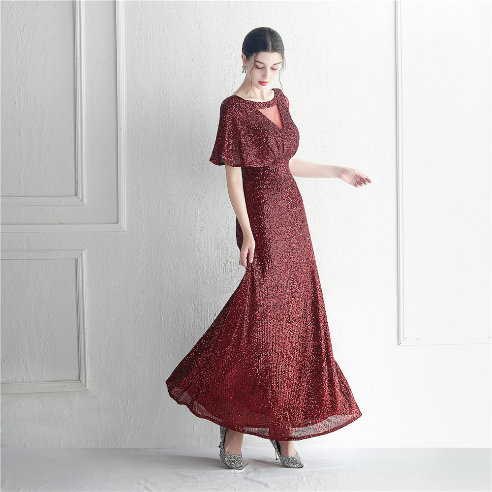 Beaded Ruffle Sleeve Mesh See-Through Evening Dress