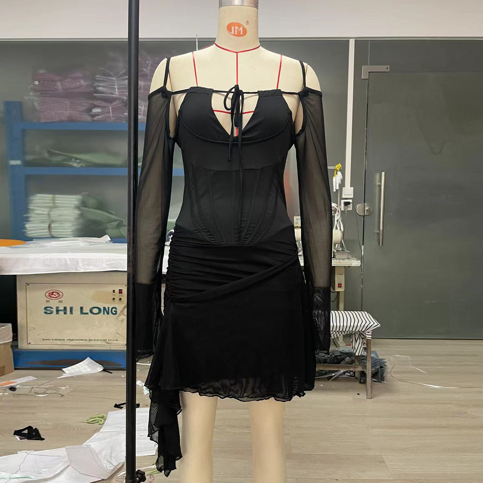 Black Mesh Off-Shoulder Pleated Girdle Dress