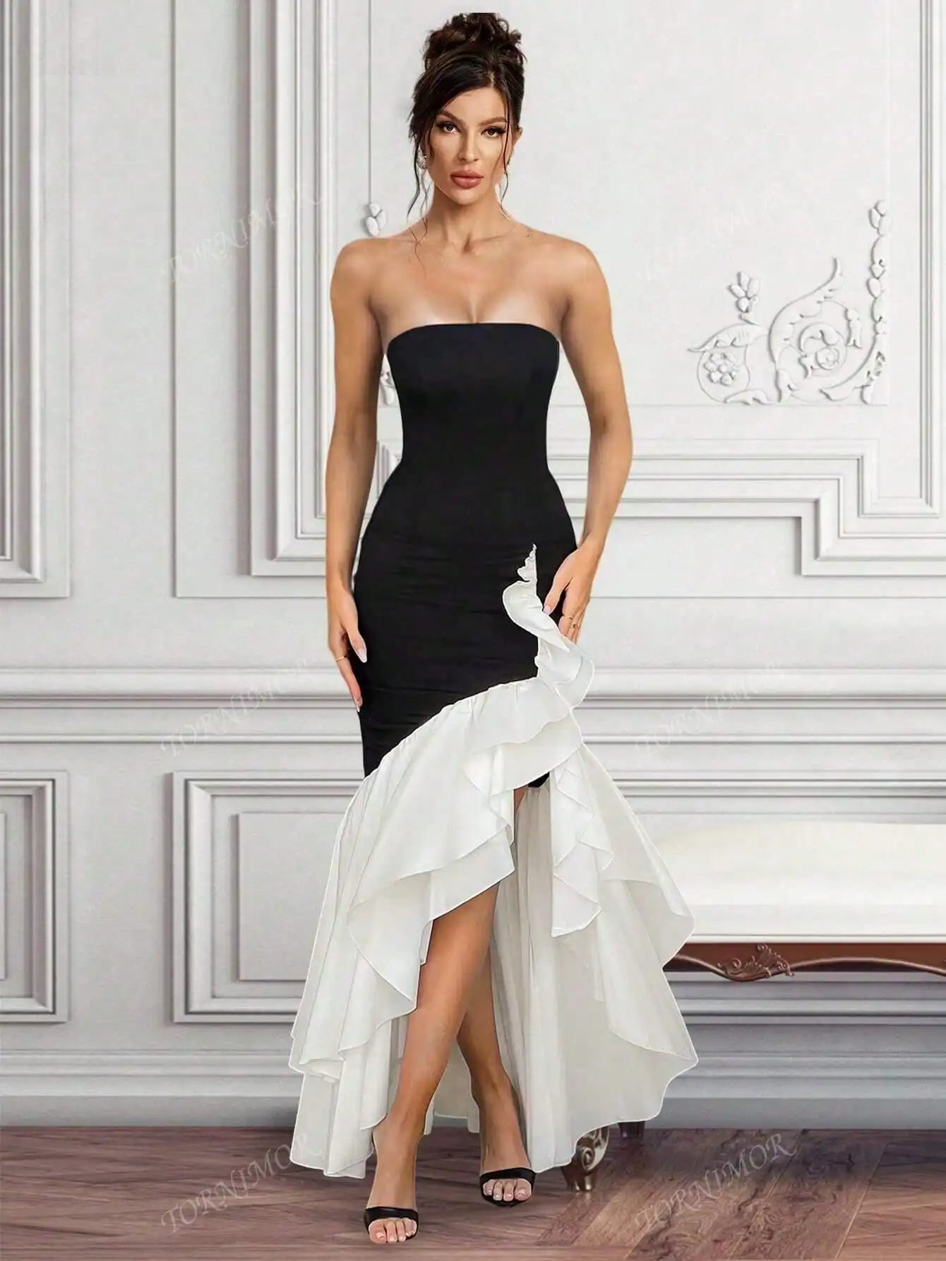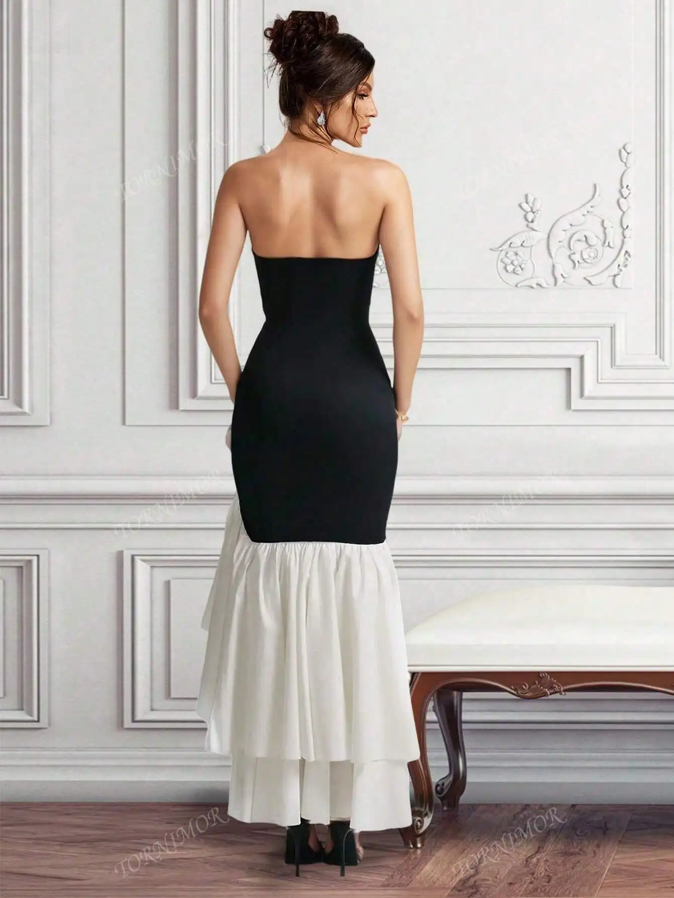 Black & White Strapless Bandage Cocktail Midi Dress