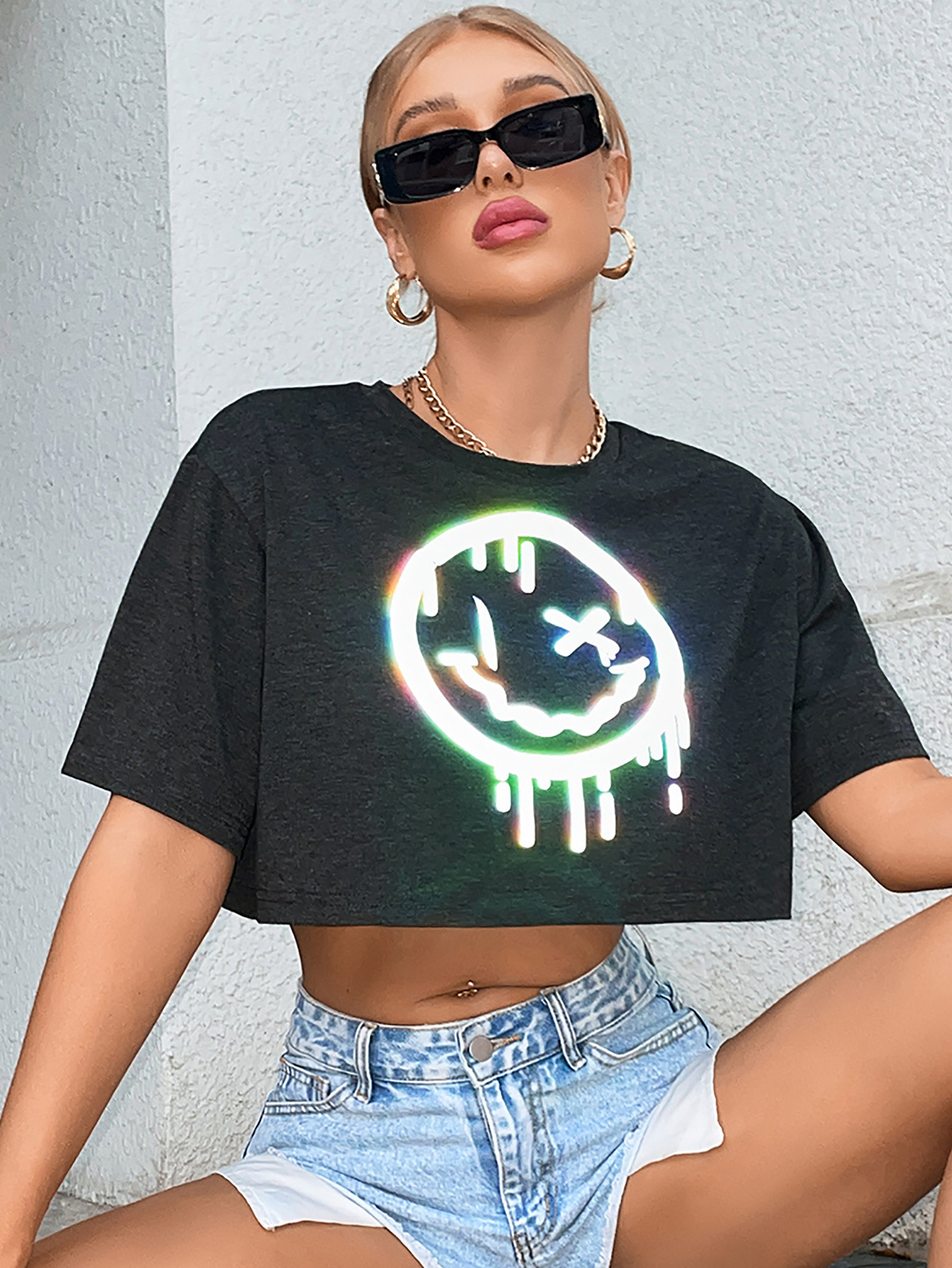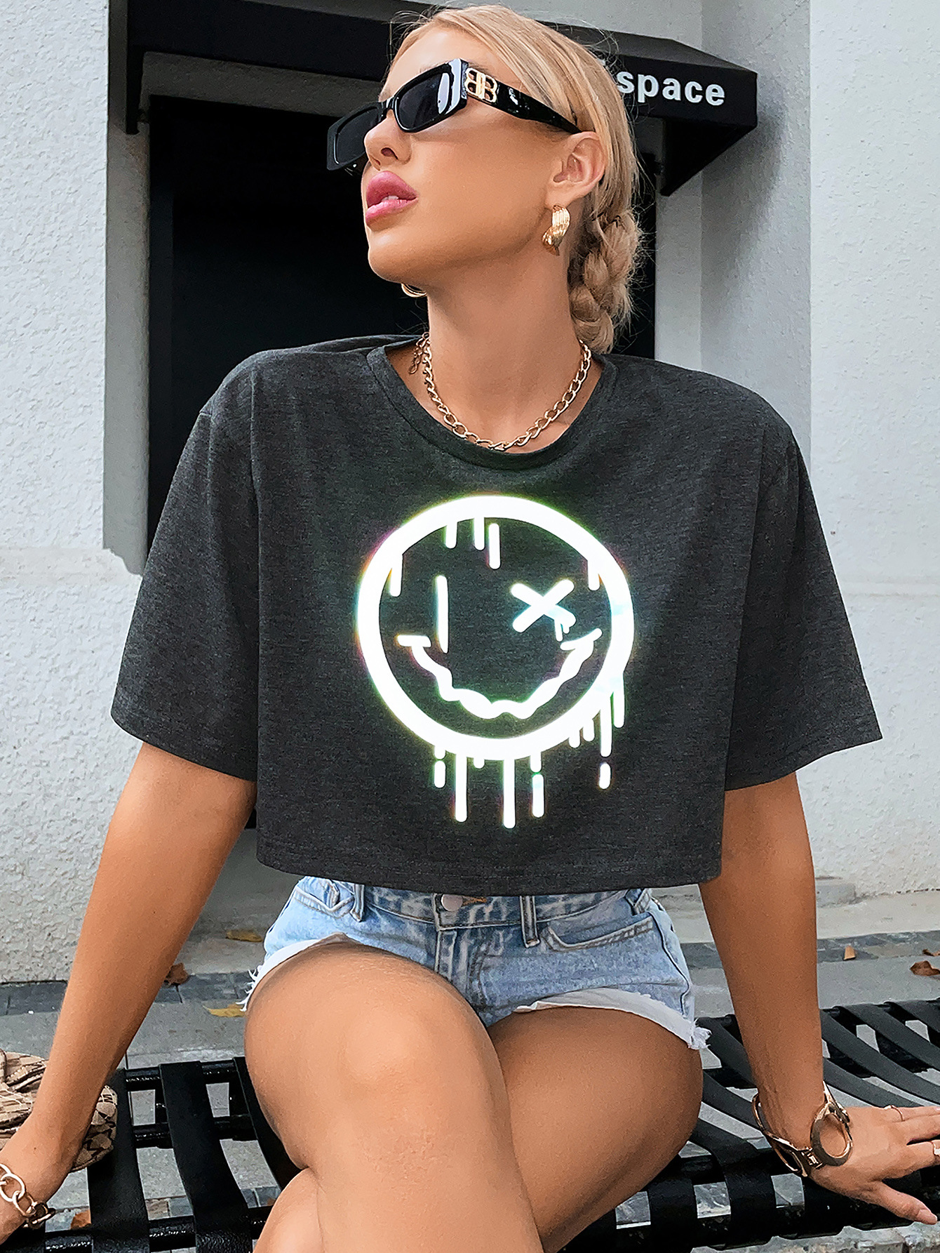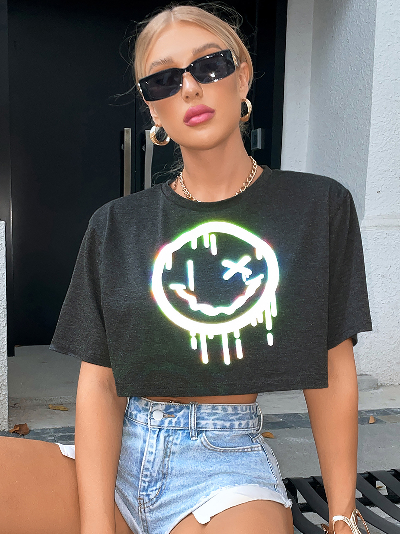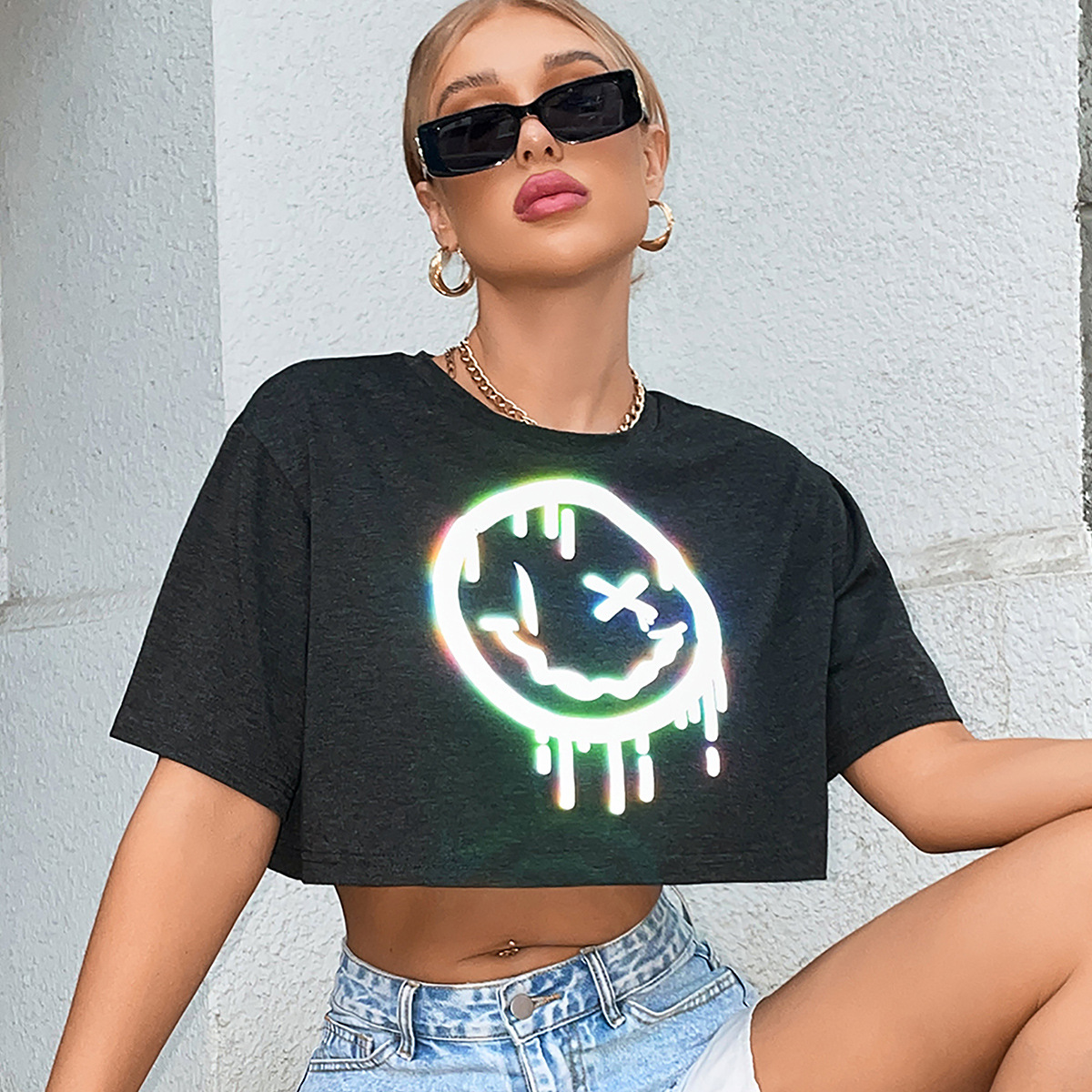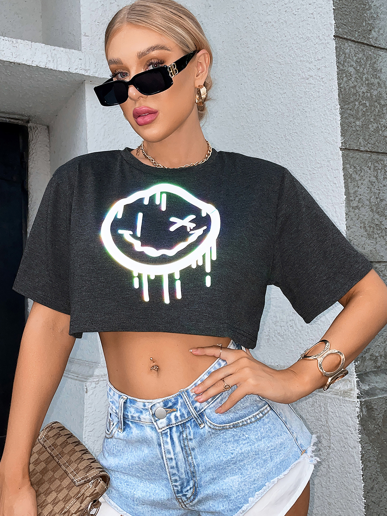 Women Clothing Shoulder Sleeve Printing Color Contrast Basic Pullover round Neck Short Sleeve T shirt Top Summer