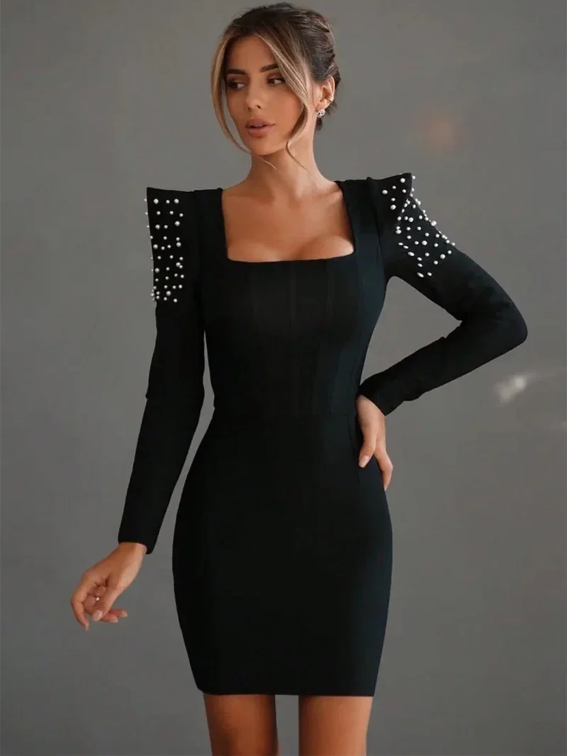 Elegant Black Pearl-Embellished Bodycon Dress