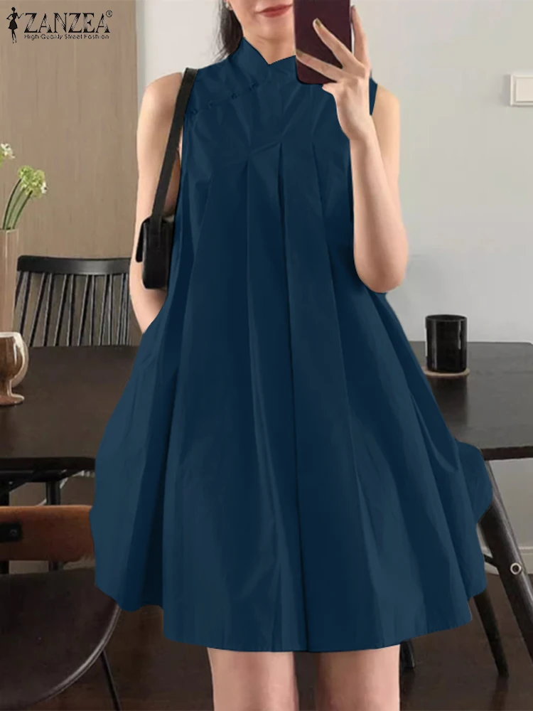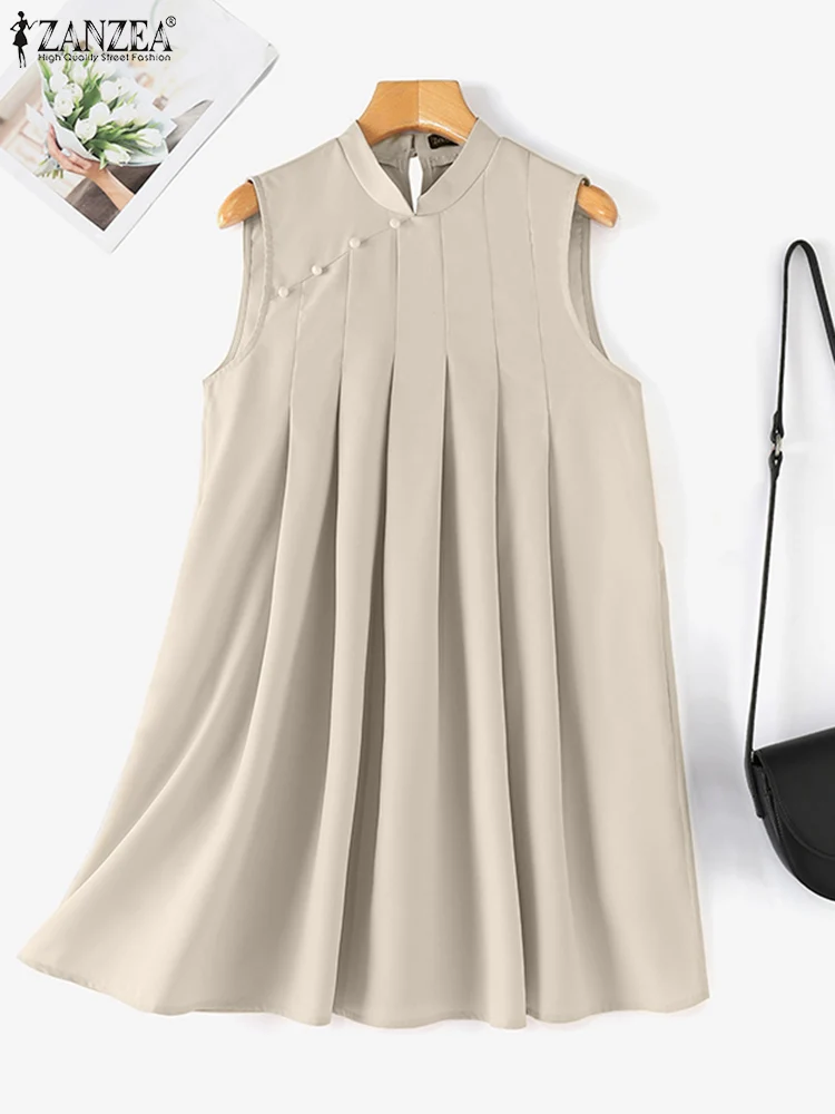 Material:100% Polyester Colors:Dark Blue,Khaki,Brown Package include:1 Dress Cutting:Regular Stretch:Not Stretchable Length:Above Knee Length Collar:Stand Collar Sleeve Style:Sleeveless Closure Type:Buttons Waistline:Standard Decoration:Pleated Features:Pocket Pattern:Solid Thickness:Standard Style:Casual,Commute,Vintage,Elegant,Street Fashion,Preppy Season:Summer Occasion:Daily,Office,Holiday,Home,Casual,Travel Label: Yes Attention: 1. Due to different computers, there may be subtle color difference between the object and the image. Please don’t shoot if you mind. Thank you. 2. There may be manual measurement error of 1-3cm. Please understand the inconvenience. 3. Please refer to the real object. The model pictures are for reference only. 4. Attention!!! Please check the size chart carefully before ordering.