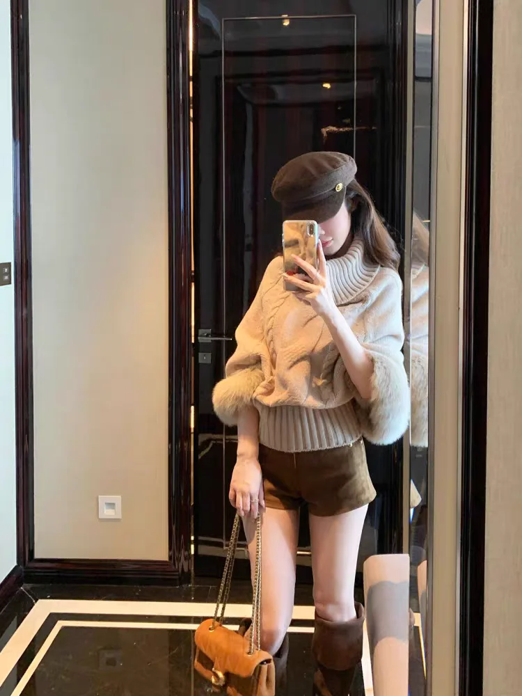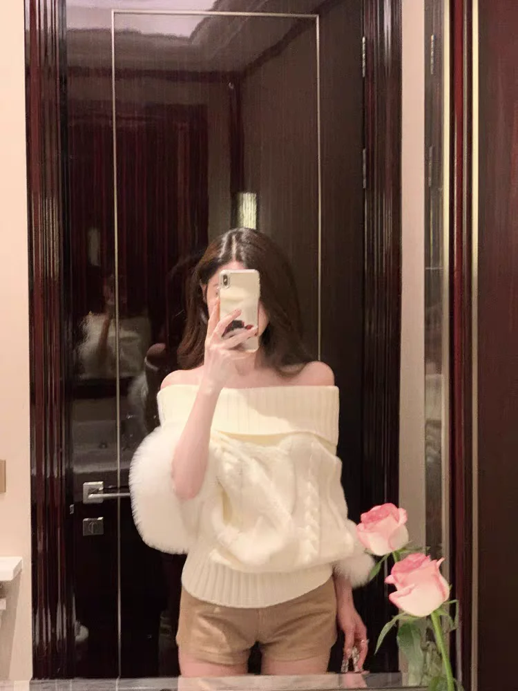 Elegant One-Shoulder Knit Sweater with Fur Collar Women