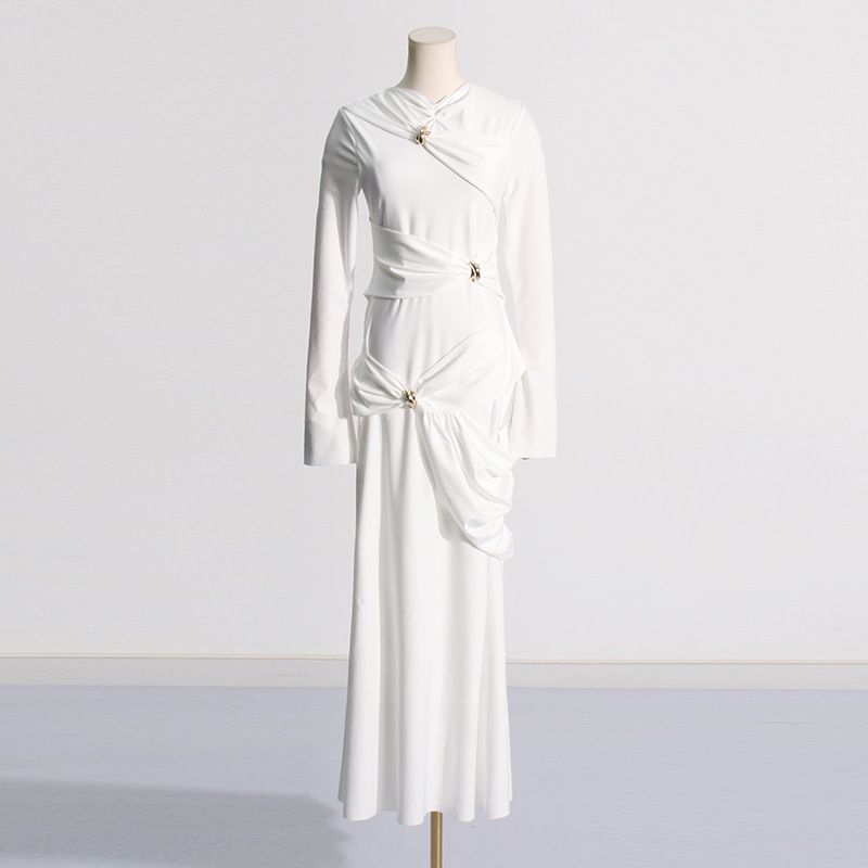 Elegant Spring Pleated Round Neck Long Pullover Dress