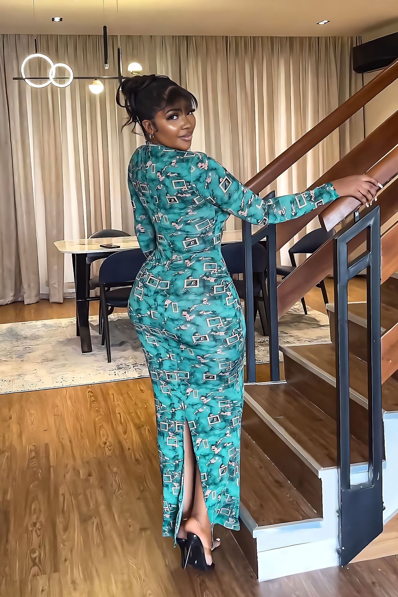 Elegant Turtleneck Long Sleeve Slim Print Maxi Dress
