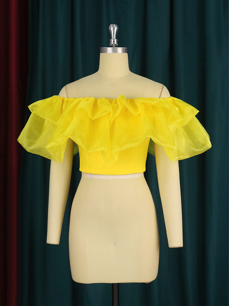 Be the first to review “Fashionable Women Clothing off-Neck Stitching Net Falbala Pleated Slim Fit Short Shirt Top for Women Tops”