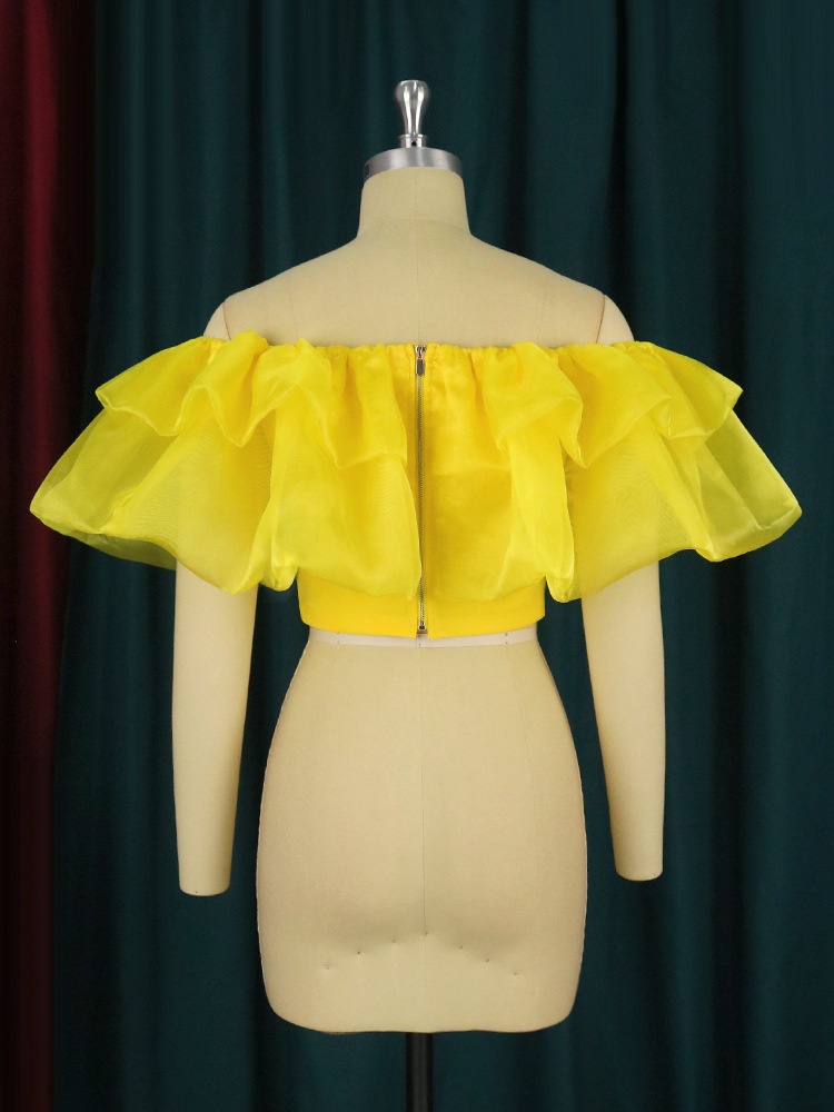 Fashionable Women Clothing off-Neck Stitching Net Falbala Pleated Slim Fit Short Shirt Top for Women Tops