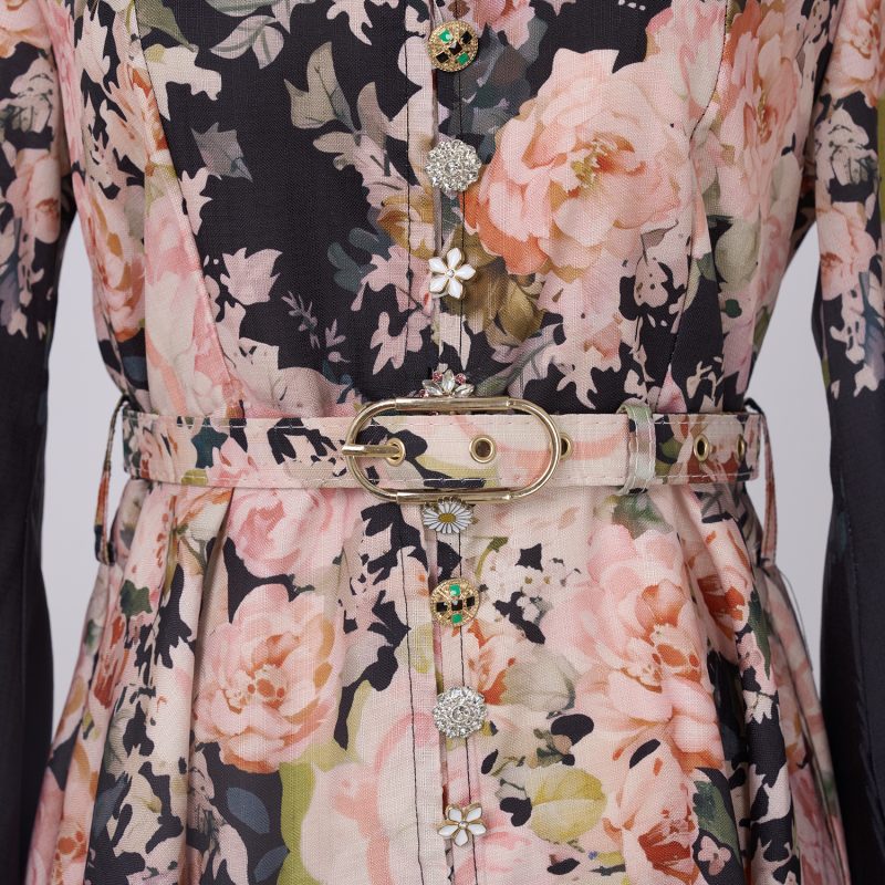 Floral Stand Collar Single-Breasted Short Dress – Long Sleeve