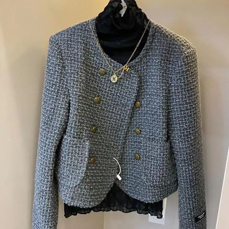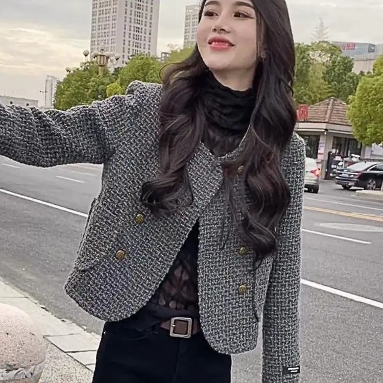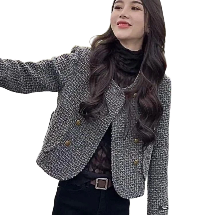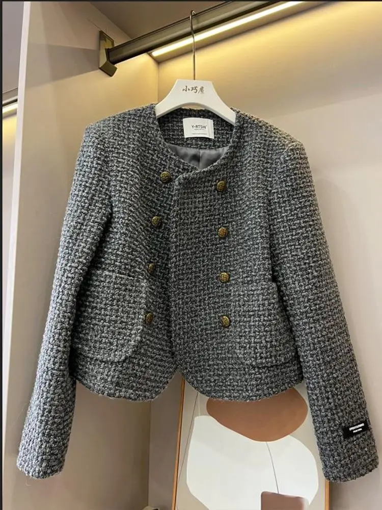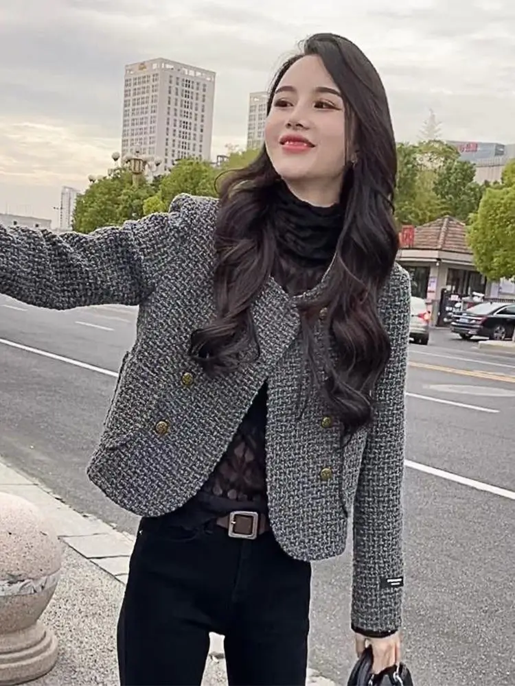 Gray Tweed Cropped Blazer Women’s Autumn Top
