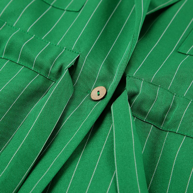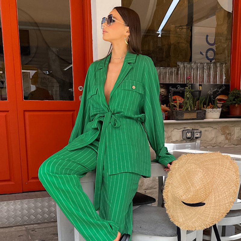 Elevate your autumn fashion with our green striped set, featuring a long-sleeved collar top and straight-leg trousers with lace-up detail. This ensemble is perfect for creating a stylish and comfortable look. The stripes and coordinated pieces add a touch of trendy sophistication to your outfit, ensuring you stand out with a fashionable and confident appearance. Make a fashion statement with the Green Striped Collar Long Sleeve Set for Autumn and upgrade your fall wardrobe with this chic and versatile outfit