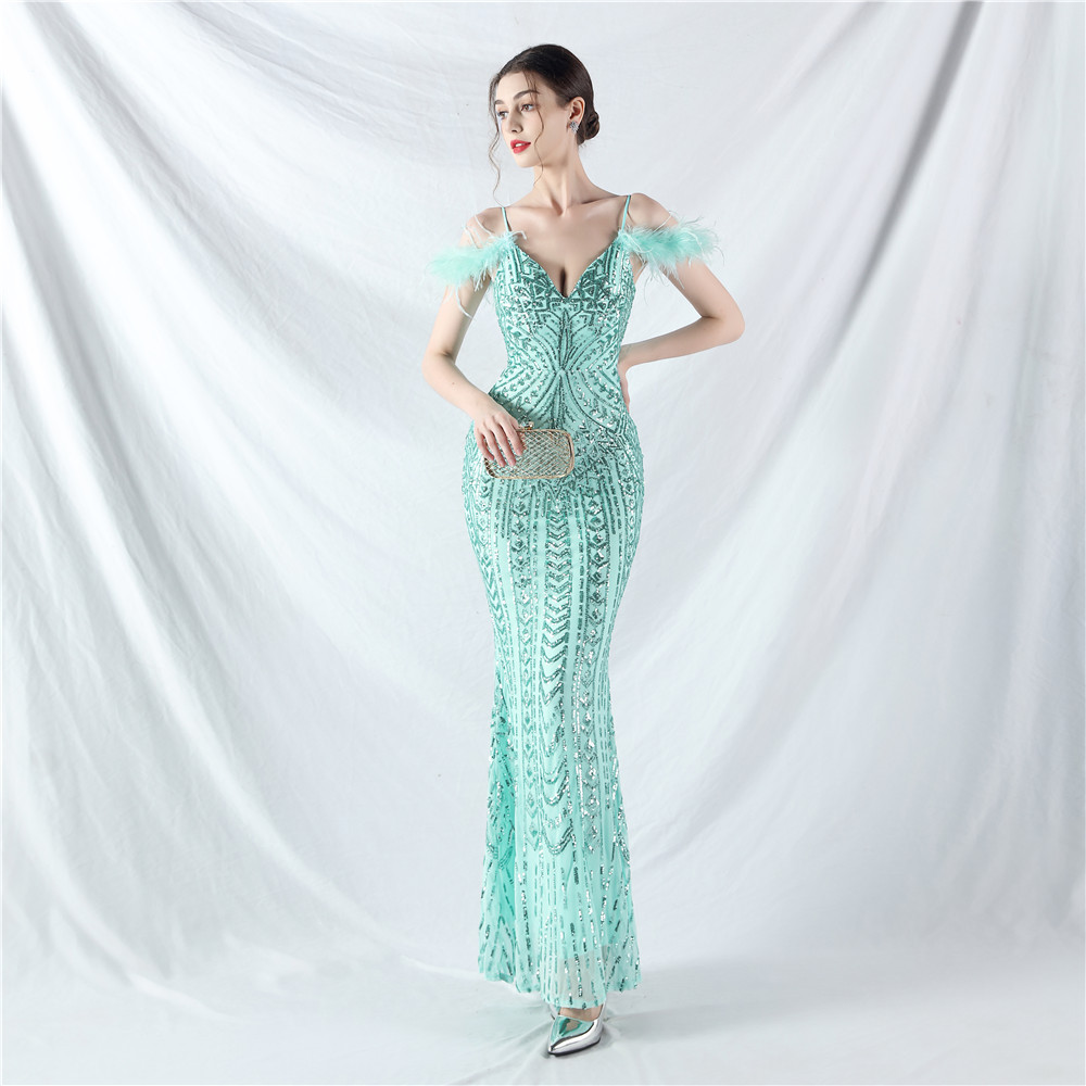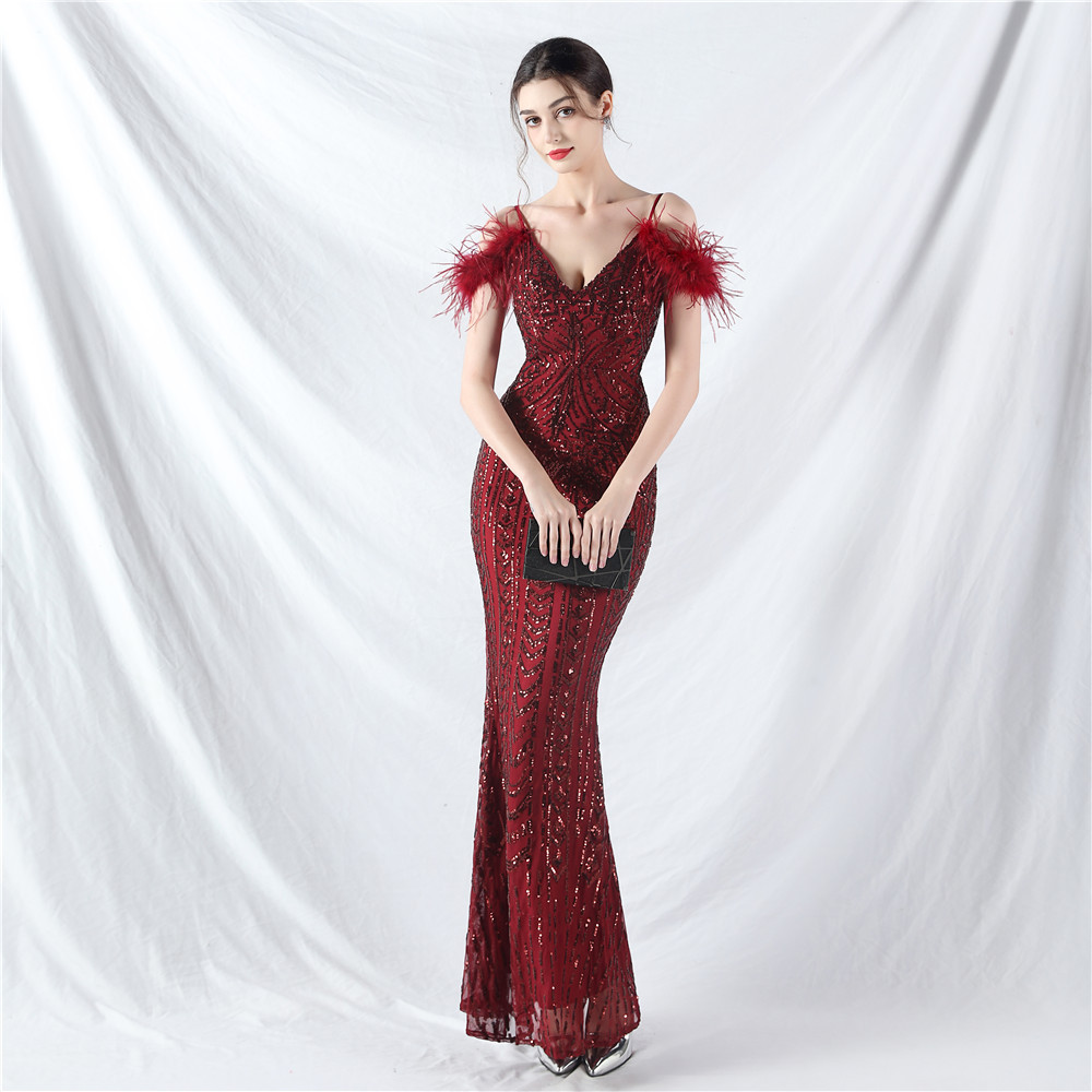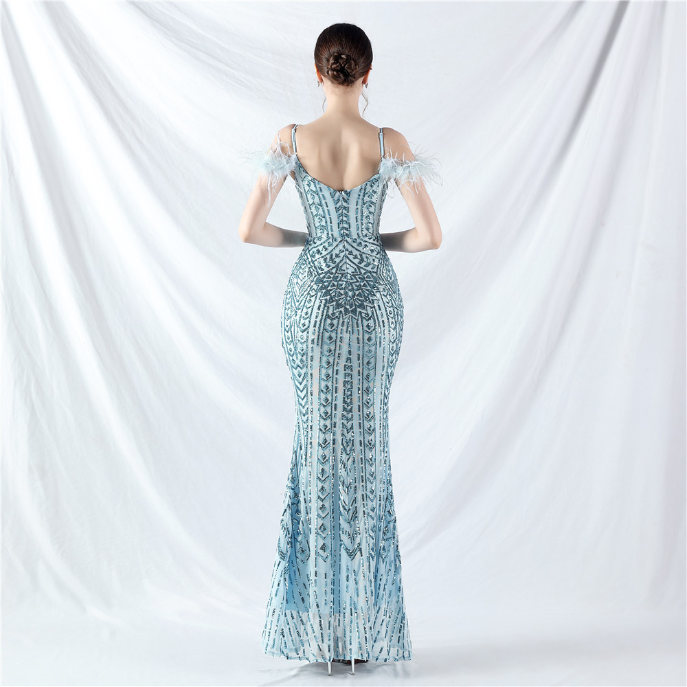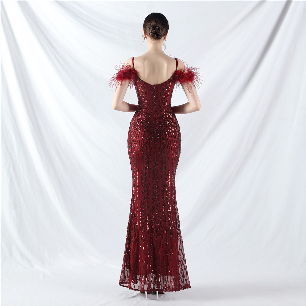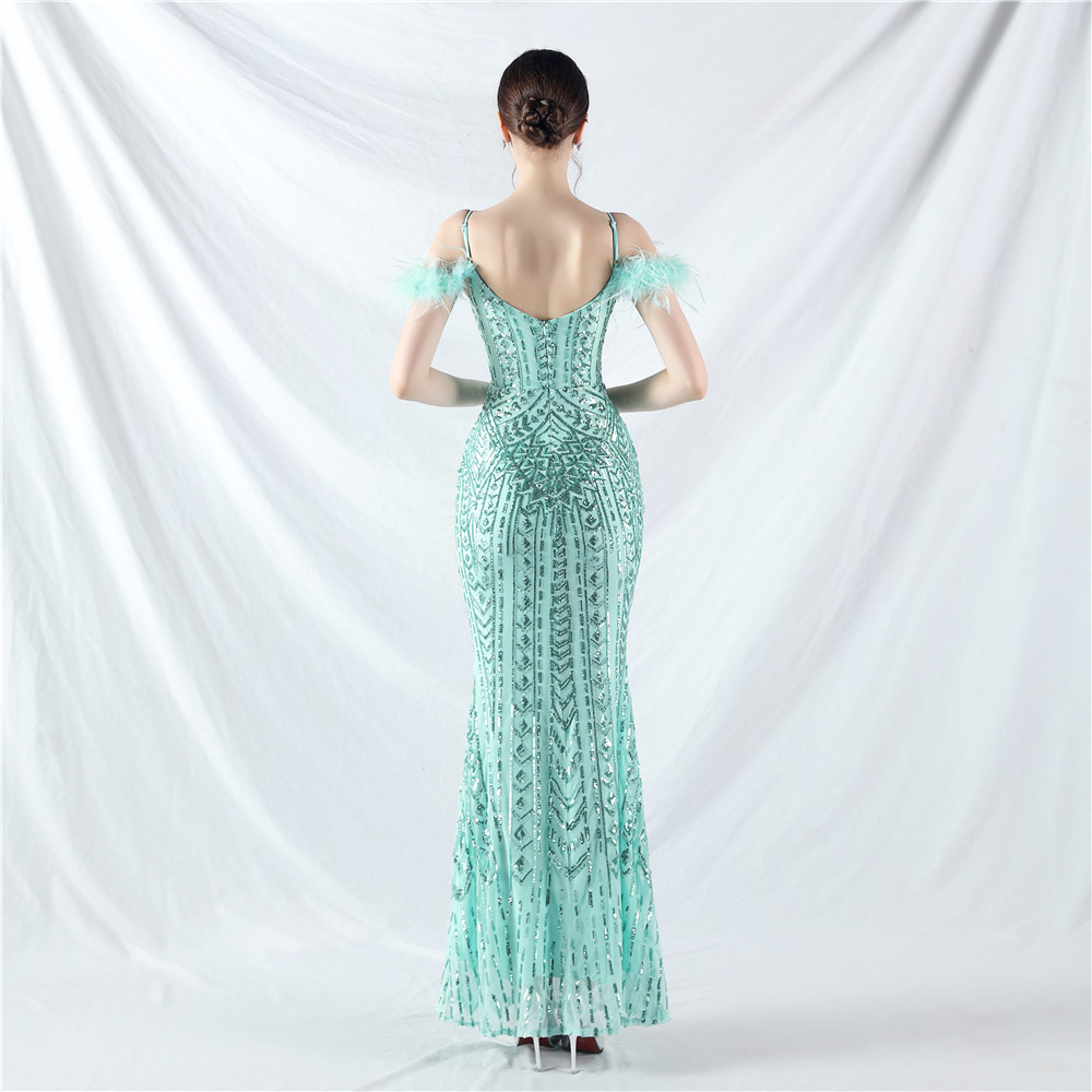 High-End Floral Sequin Ostrich Hair Evening Dress