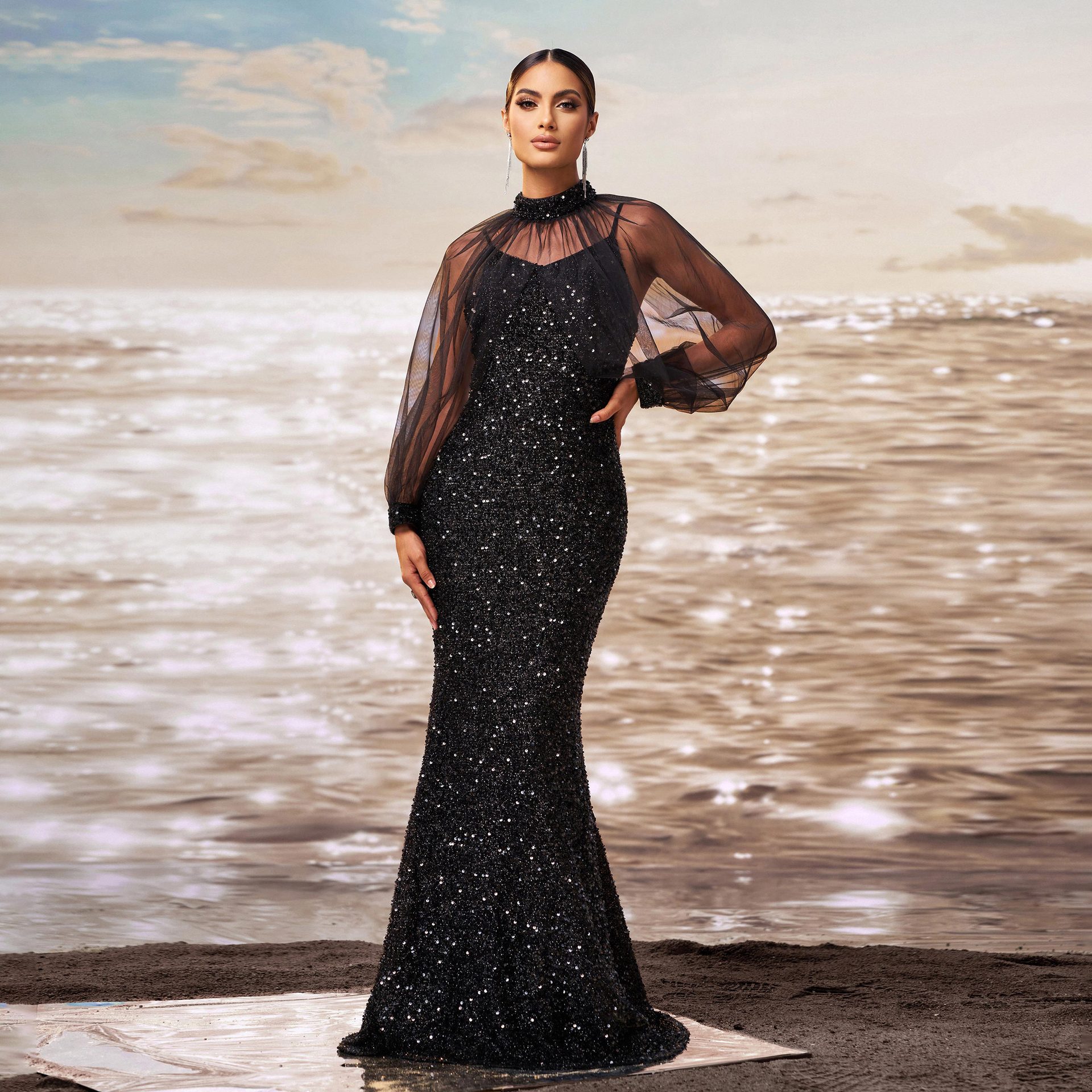 High-End Sequined Fishtail Long Sleeve Evening Dress