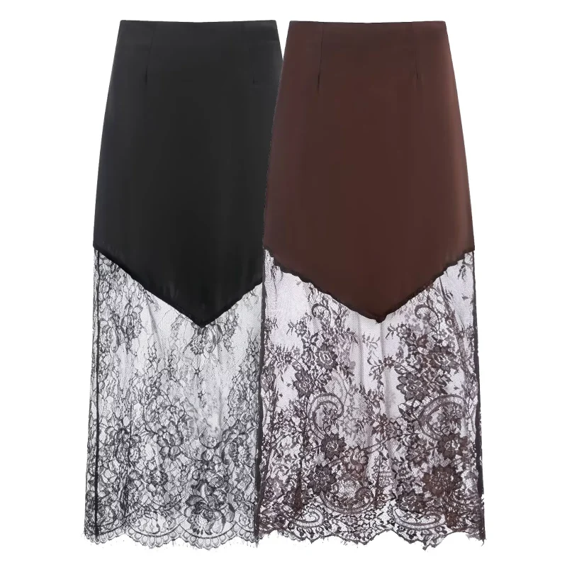 Spring Summer High Waist Lace Hem Slit Midi Skirt
