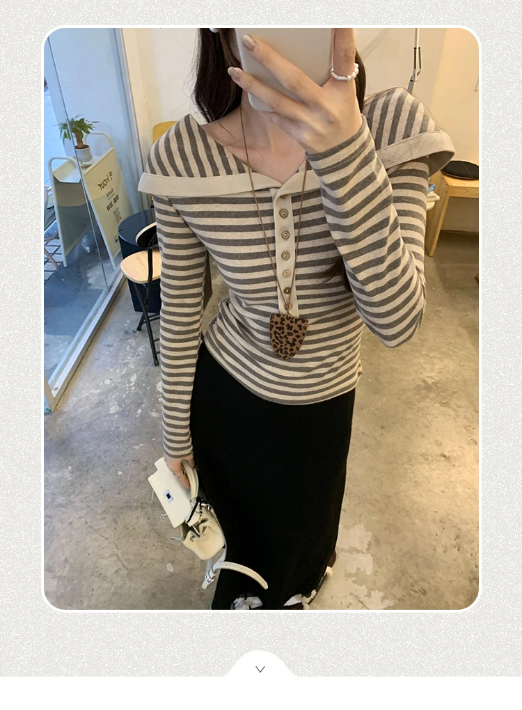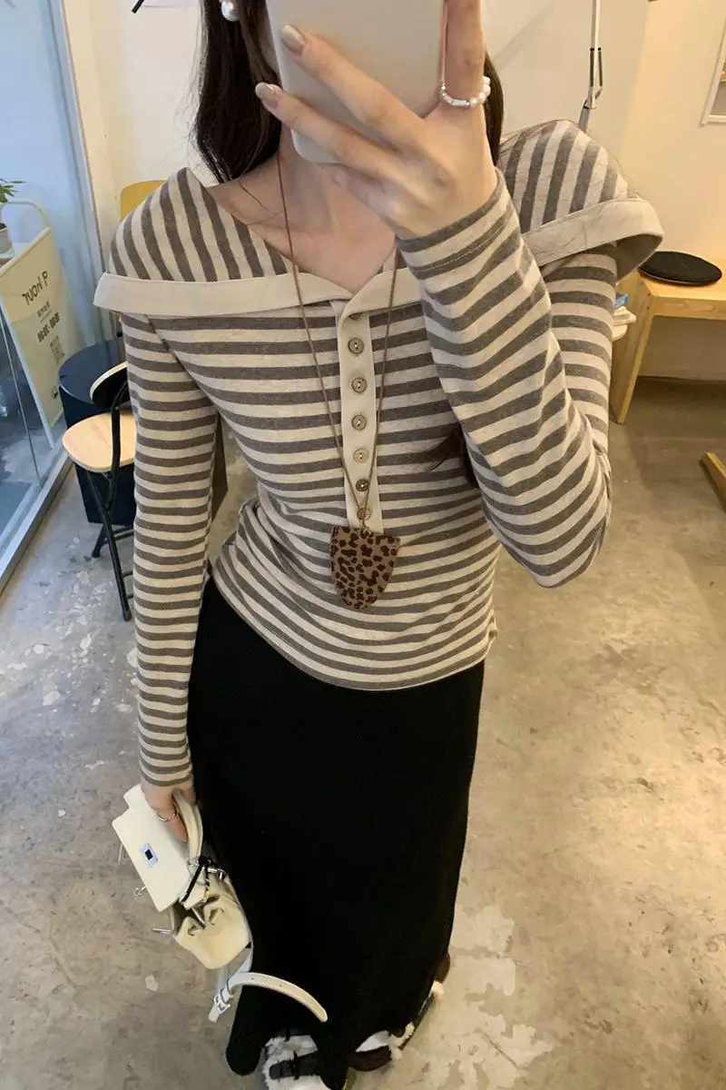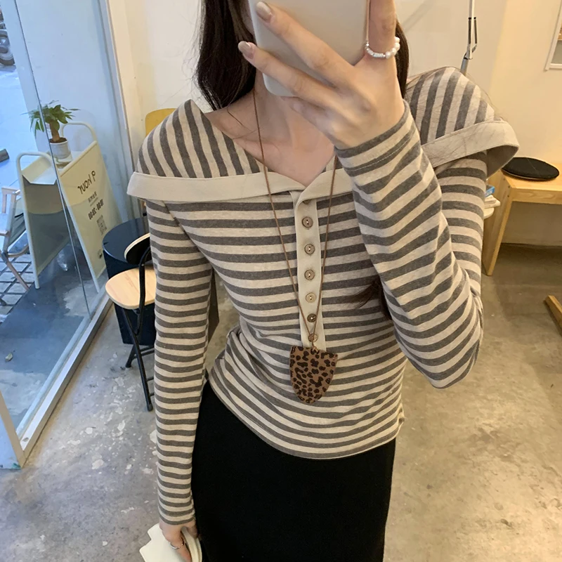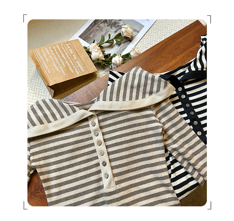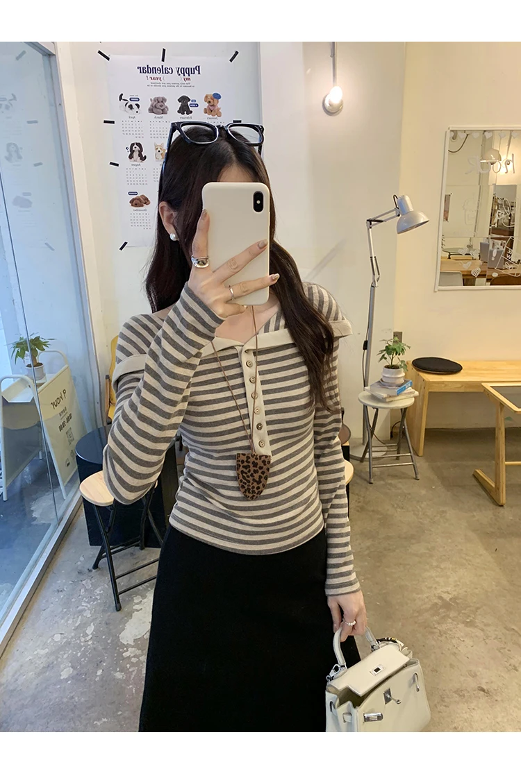 Korean Fashion Striped Lapel T Shirt for Women Autumn Top