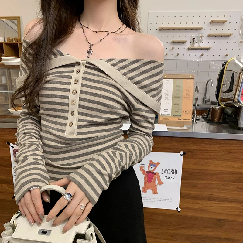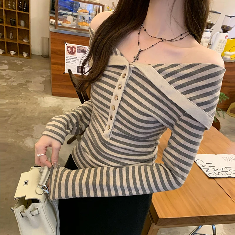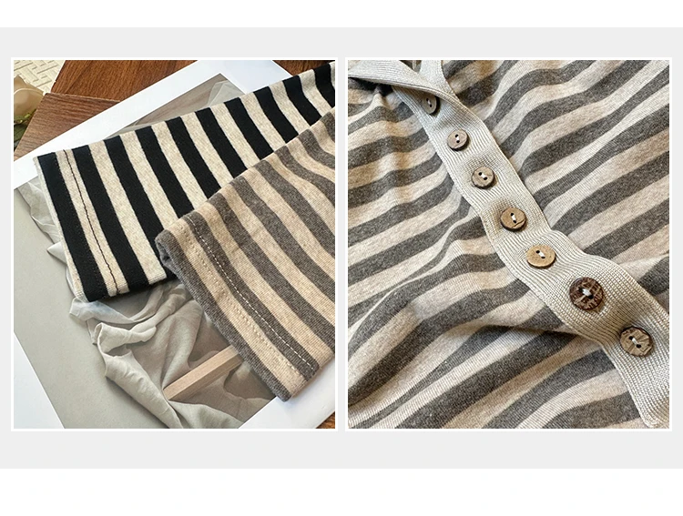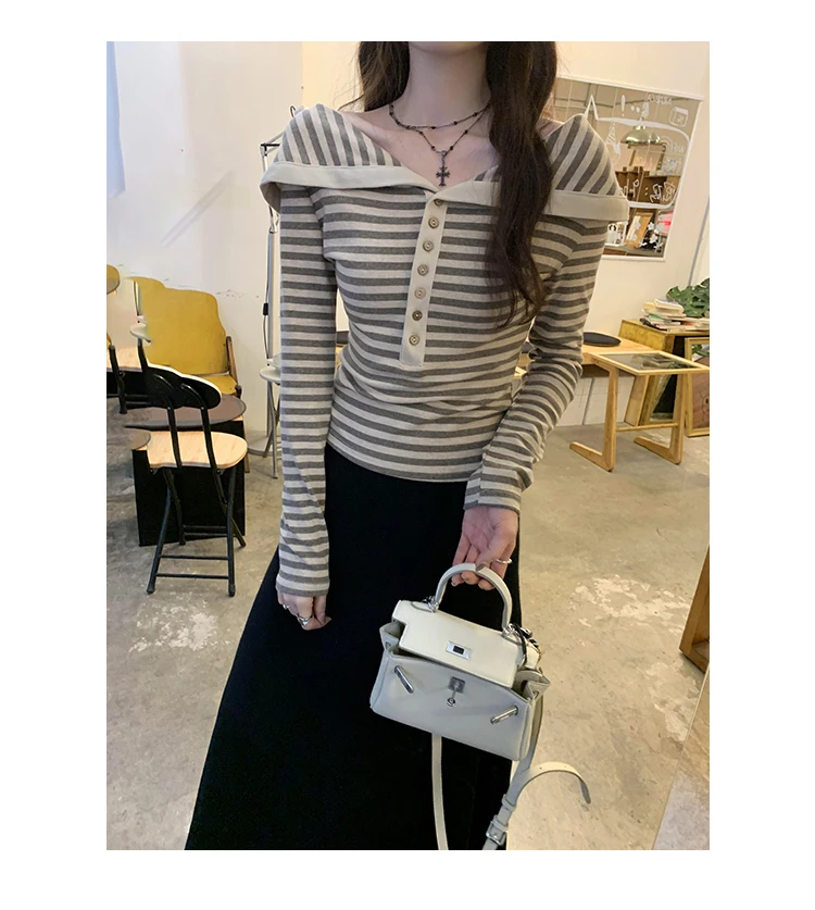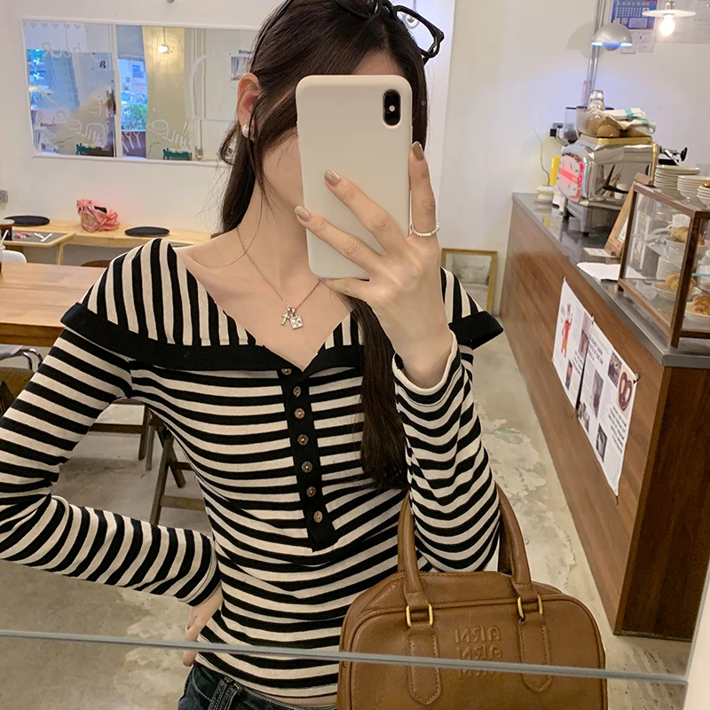 Korean Fashion Striped Lapel T Shirt for Women Autumn Top