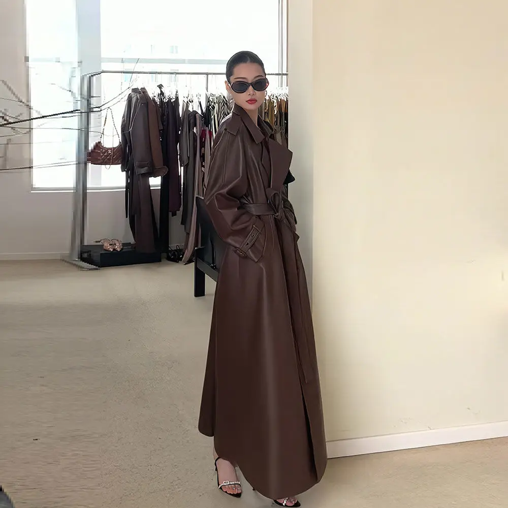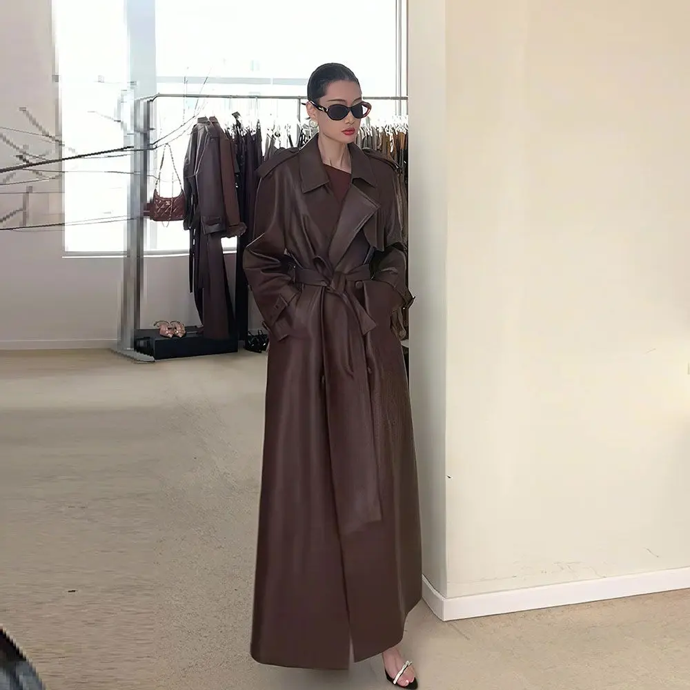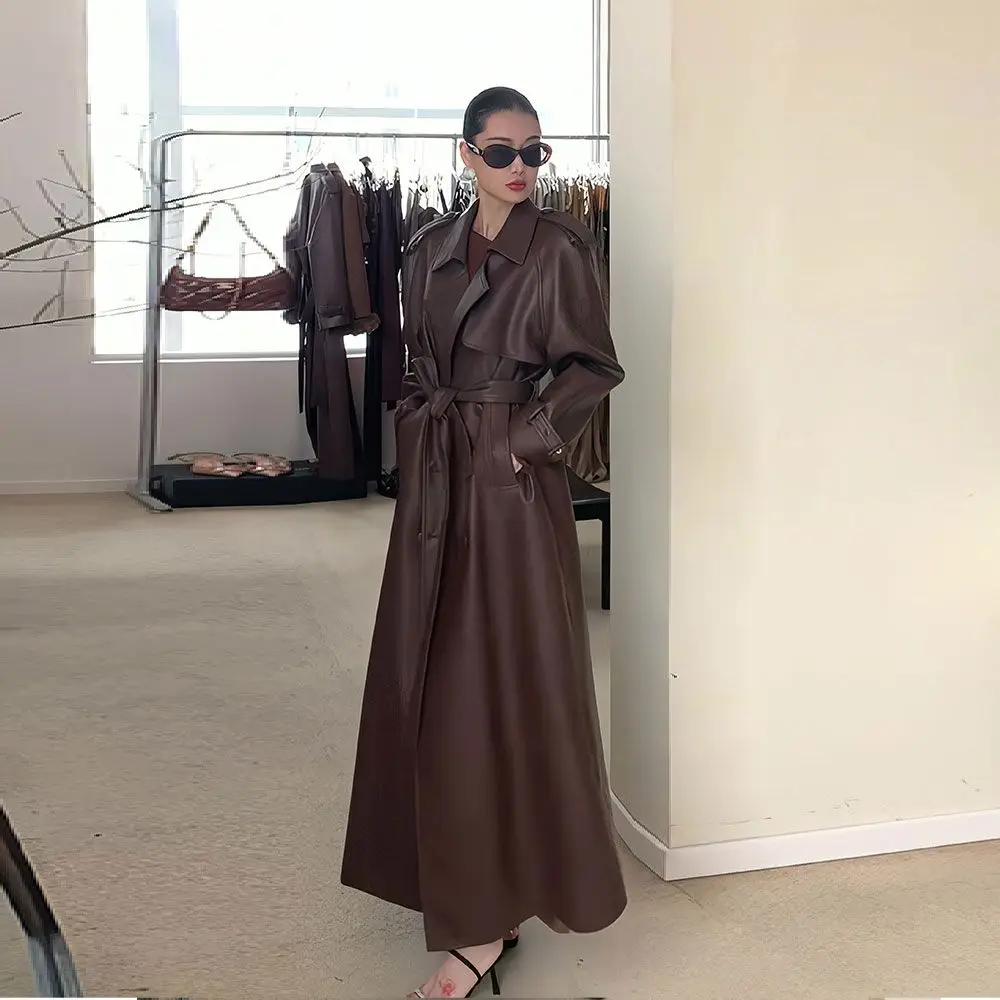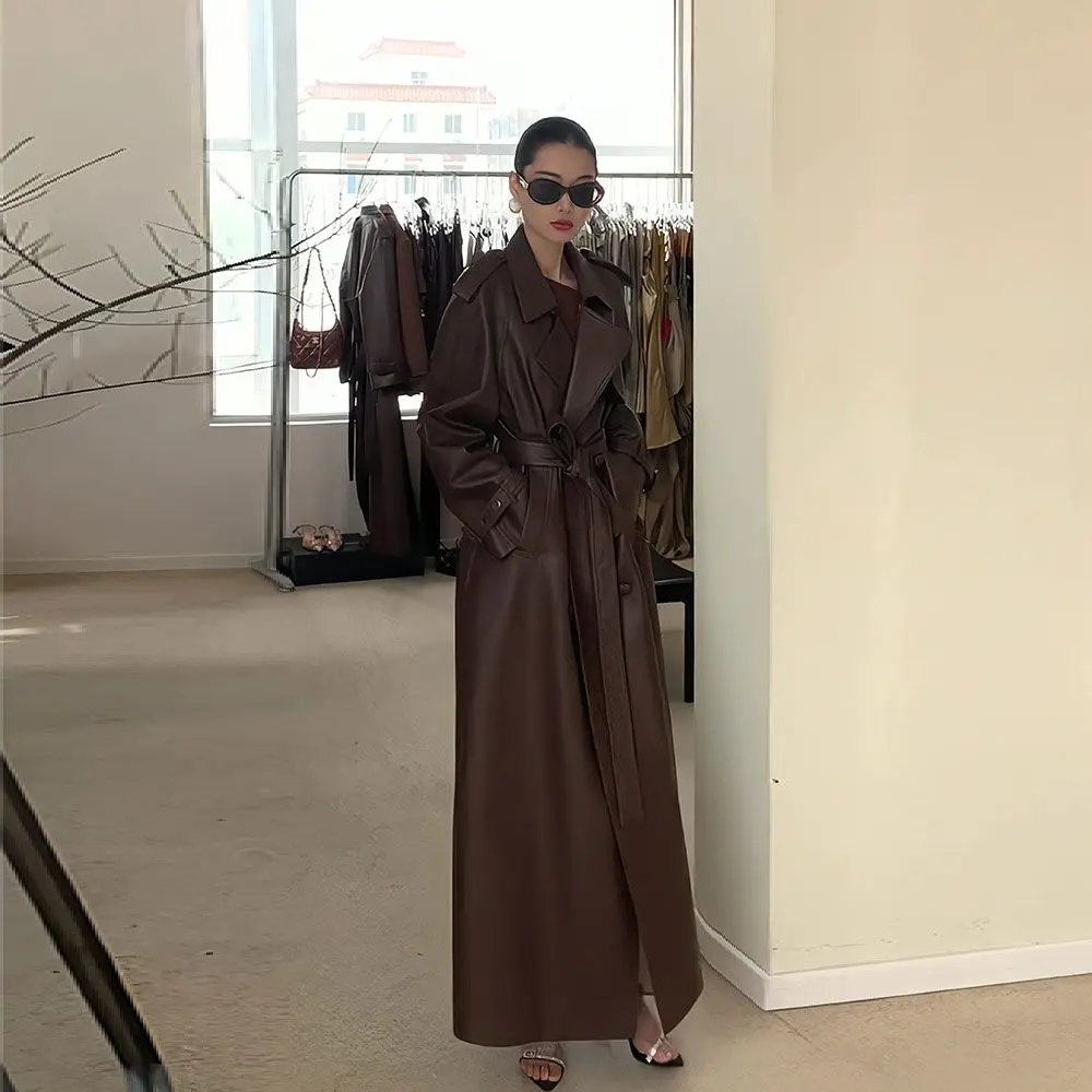 Luxury Brown Slim Fit Leather Trench Jacket