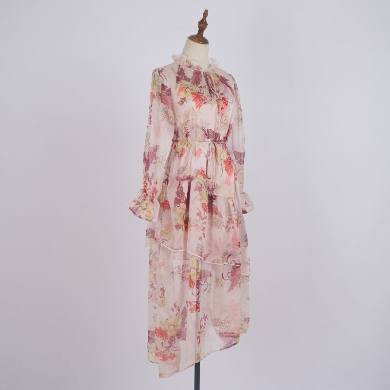 Single-Breasted Stand Collar Lantern Sleeve Printed Dress