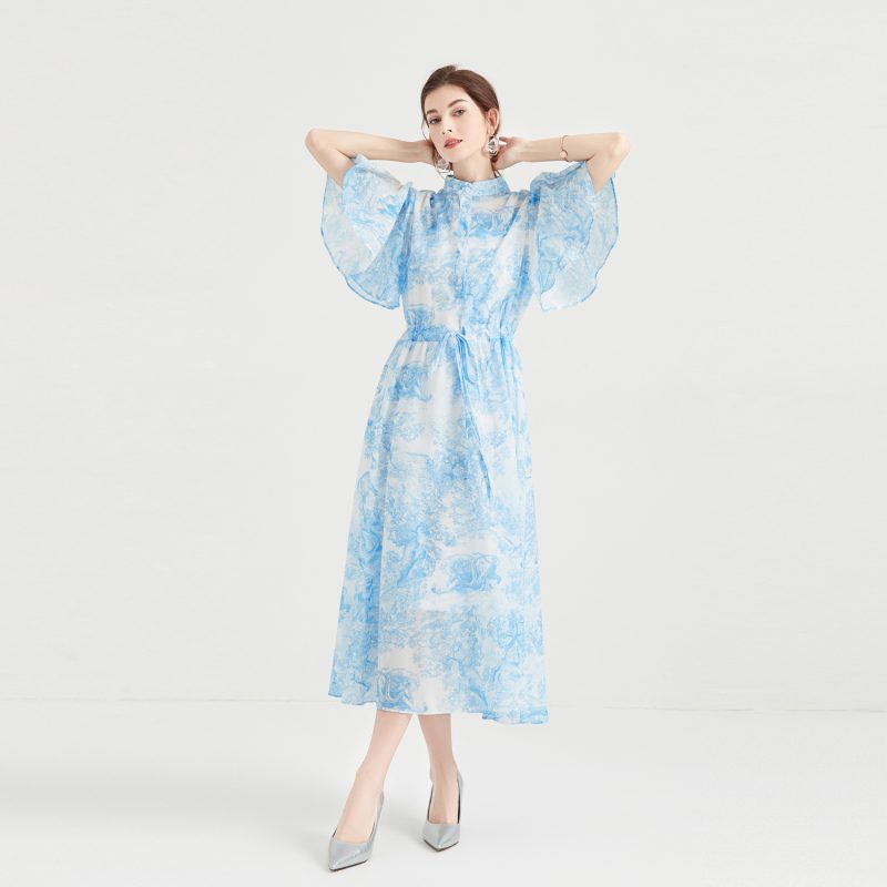 The plant print adds a touch of nature-inspired sophistication, while the lotus leaf sleeves provide a stylish and feminine detail. The single-breasted design offers a classic and timeless appeal, making this dress suitable for various occasions. The drawstring feature allows you to customize the fit, adding a modern and playful element to the overall design.