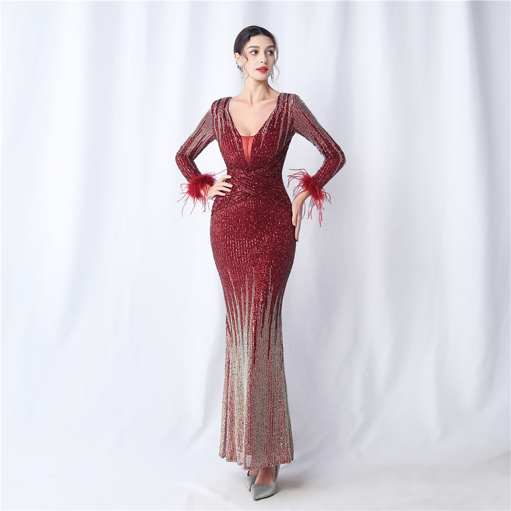 Ostrich Feather Gradient Sequin Long Sleeve Dress