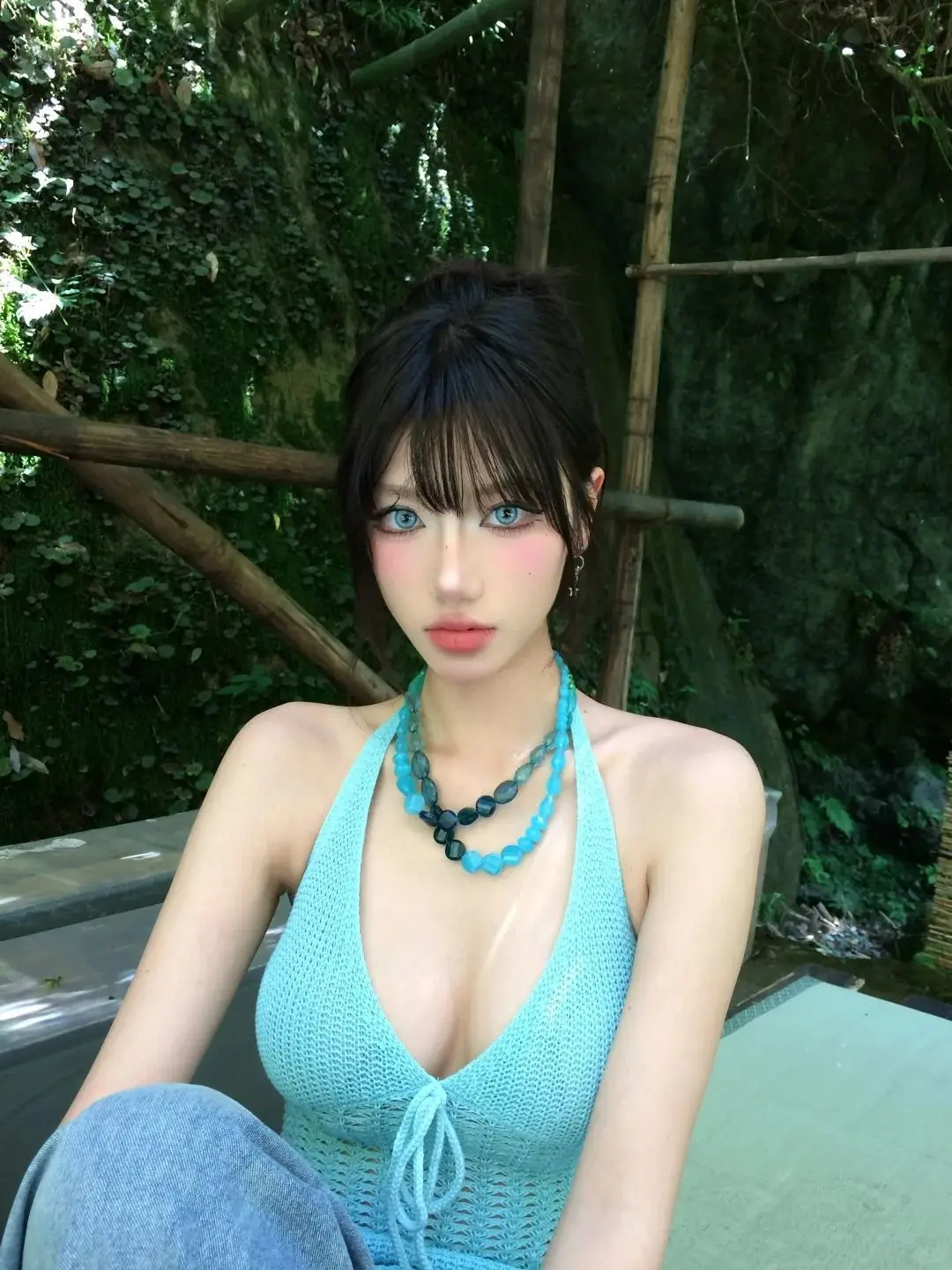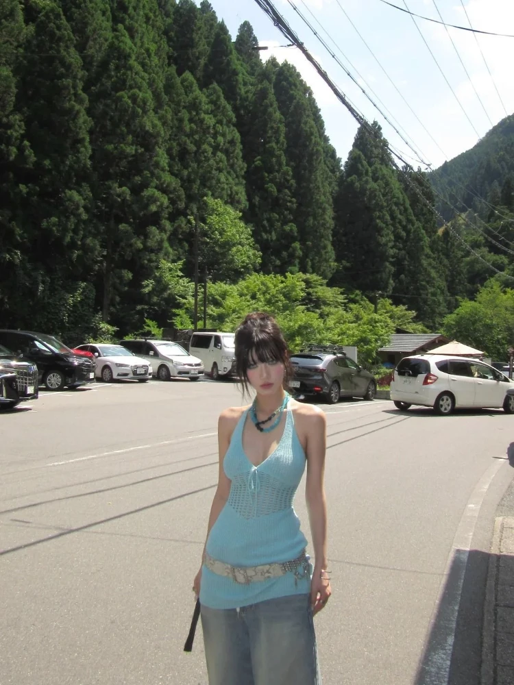 Plus Size Blue Knitted Halter Top Sexy Backless Vest