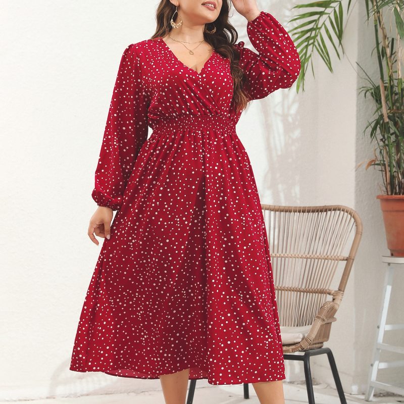 Plus Size V-Neck Pulled Long Sleeve Dress