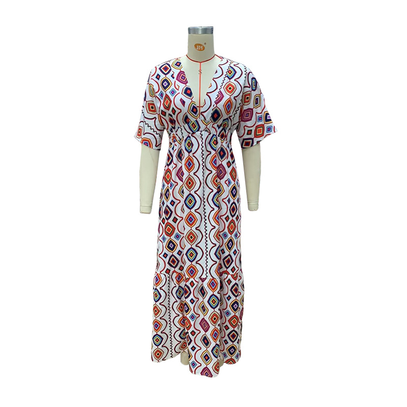 Printed V-Neck Bohemian Mid-Length Autumn Dress