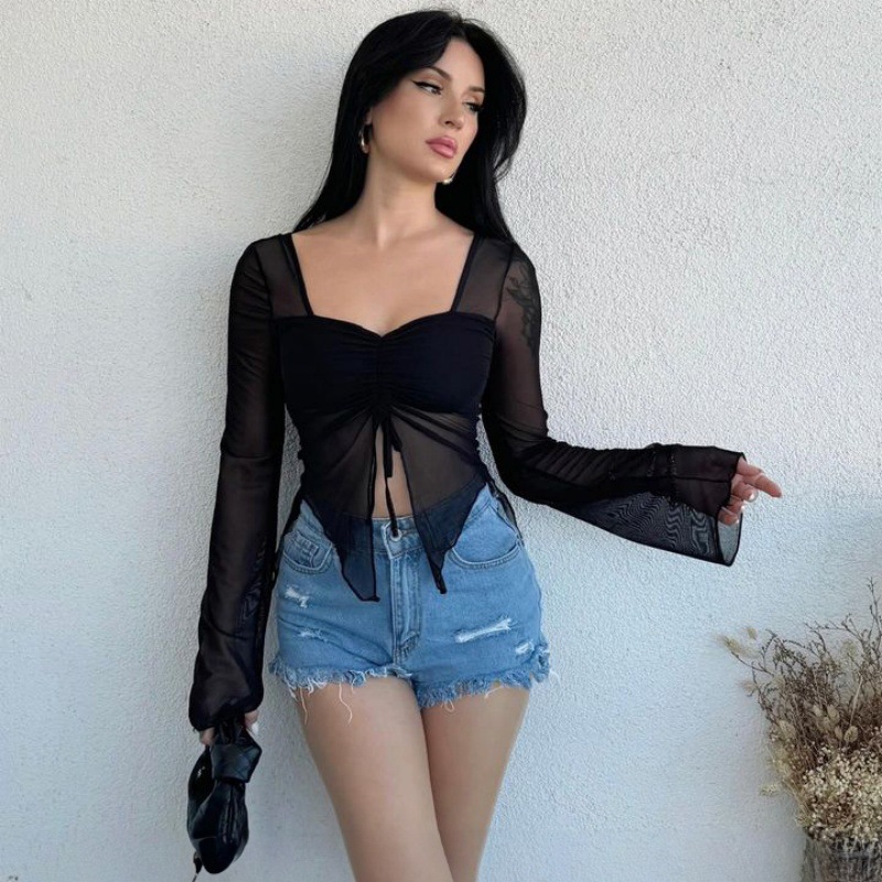 Sexy Cropped Mesh Lace-Up Backless Long Sleeve Top