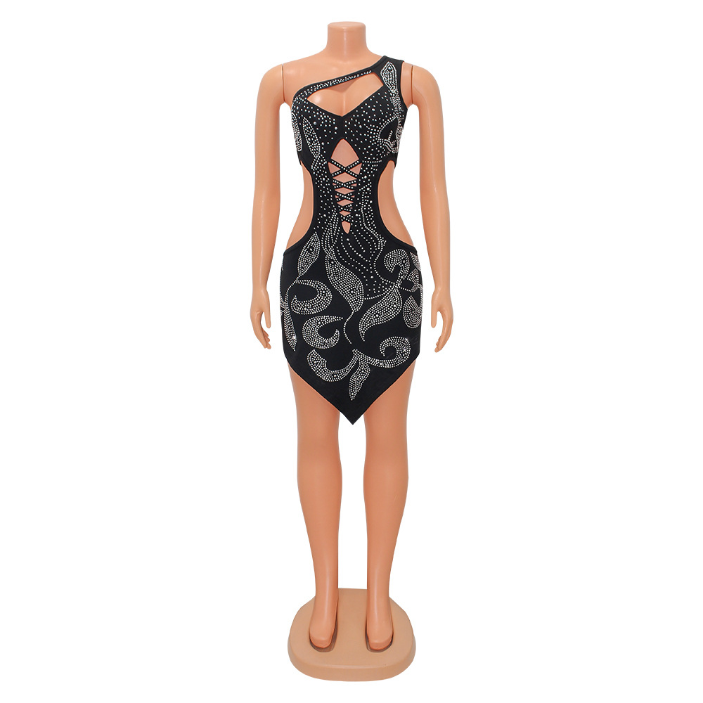 Sexy Hollow Out Rhinestone Oblique Shoulder Asymmetric Dress Women