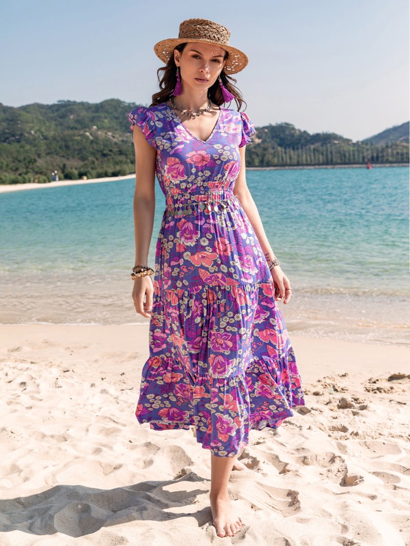 Discover elegance and comfort with this slimming purple dress featuring a flattering V-neckline and an elastic waist. The high waist design adds a touch of sophistication, making it a perfect choice for various occasions. Embrace style and confidence with this must-have addition to your wardrobe.