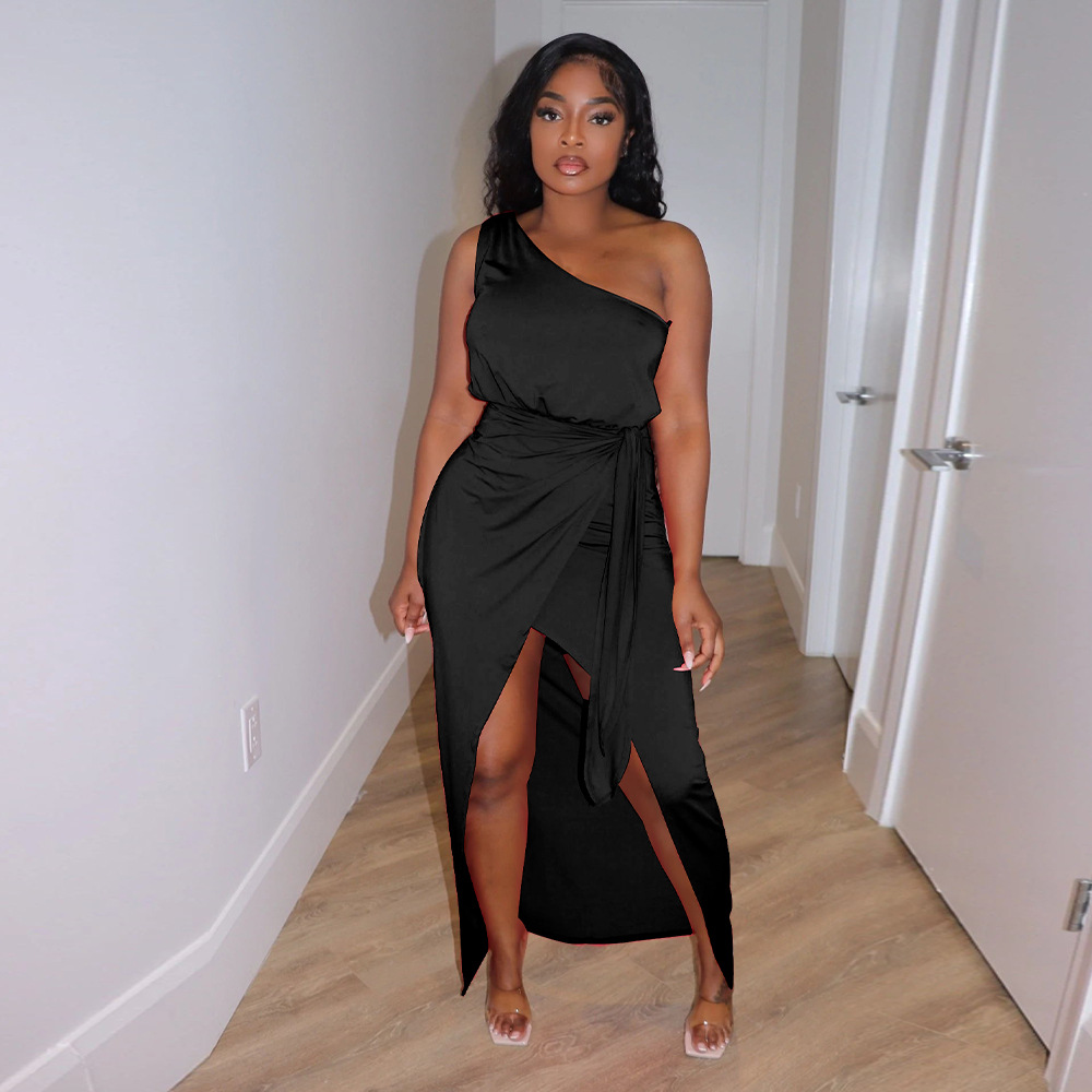 Solid Color Asymmetric Oblique Shoulder Slim Dress