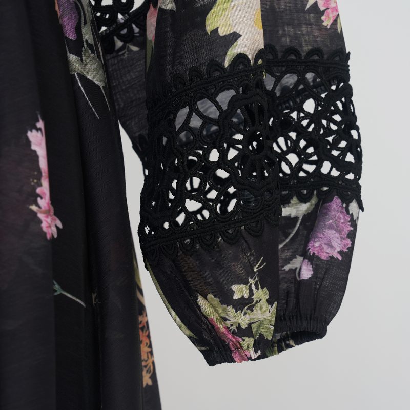 Autumn Floral Buckle Lantern Sleeve Short Dress