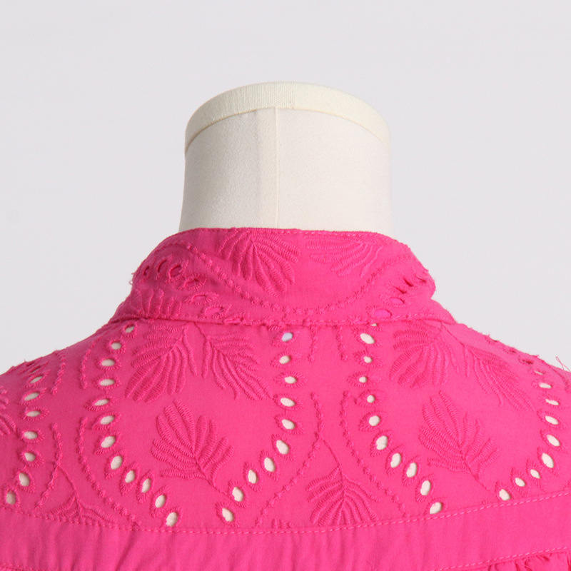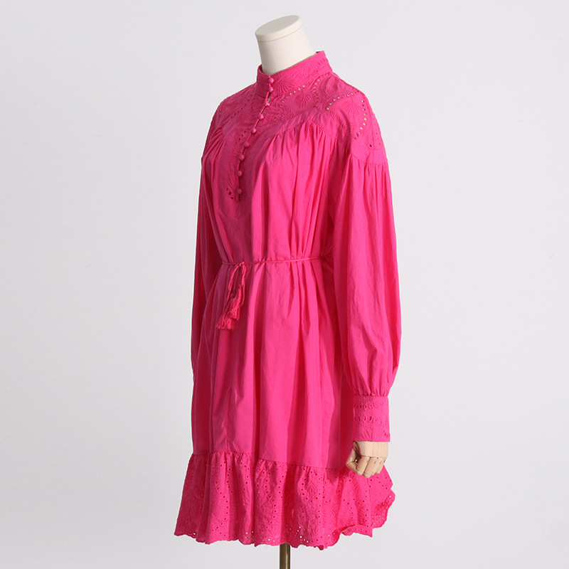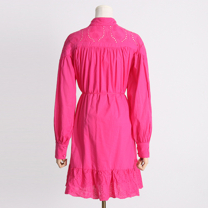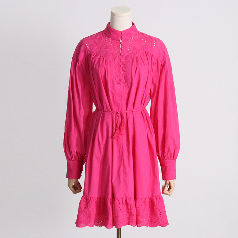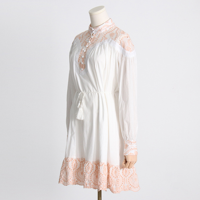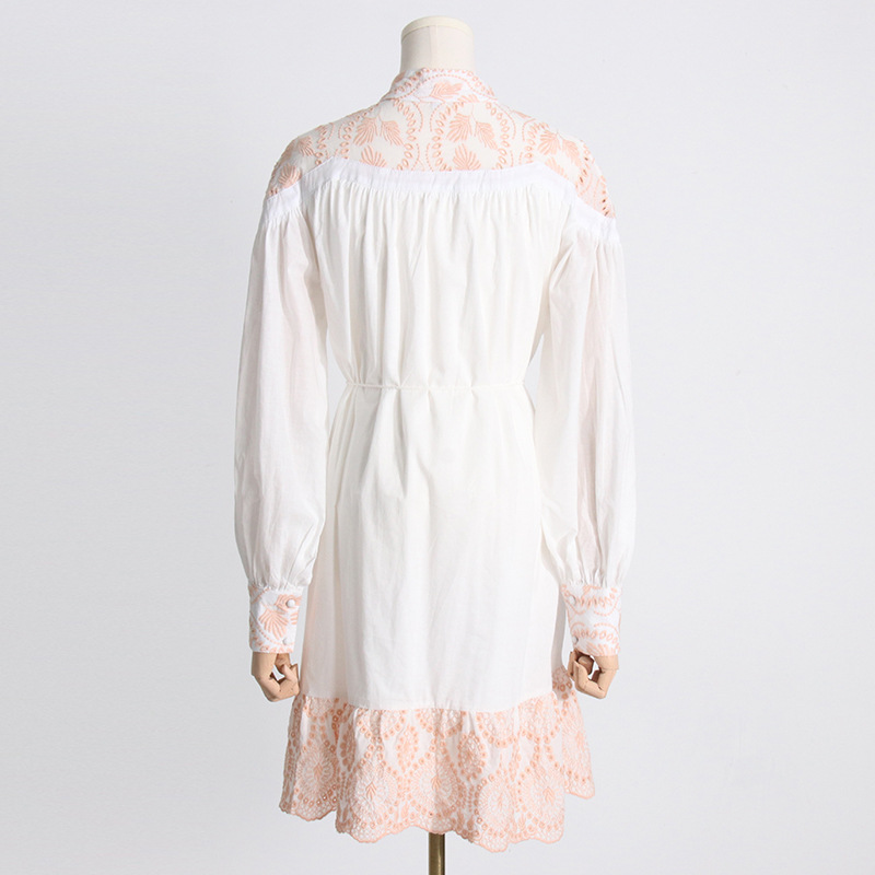 Spring Elegant Lace Hollow Out Cutout Embroidered Simple Lace up Waist Controlled Slimming A line Dress for Women
