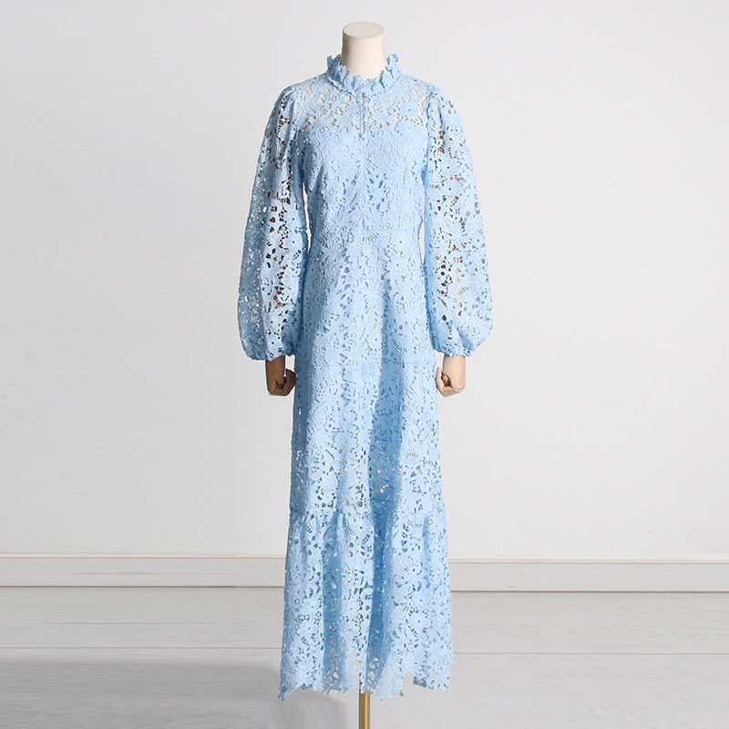 Spring Maxi Dress with Embroidered Lantern Sleeves