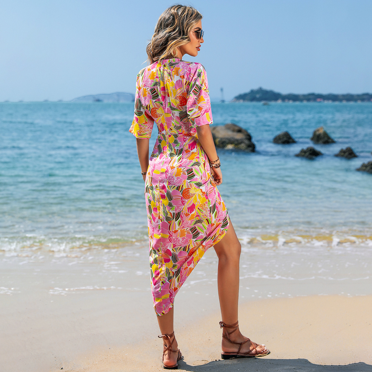 Be the first to review “Spring Summer Floral Print Slit Dress V neck Short Sleeve Belt Waist Dress”