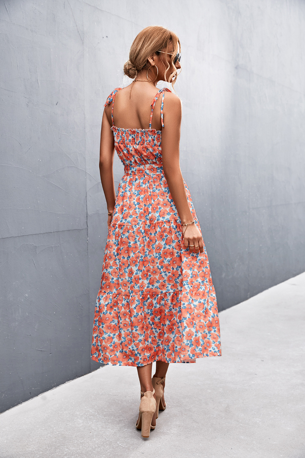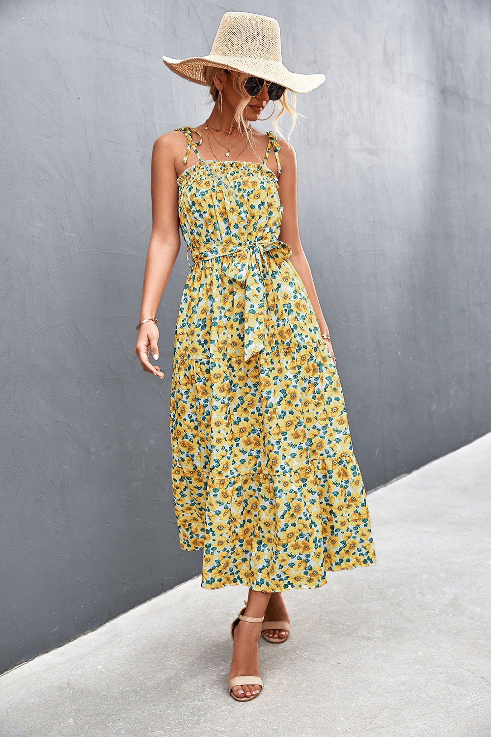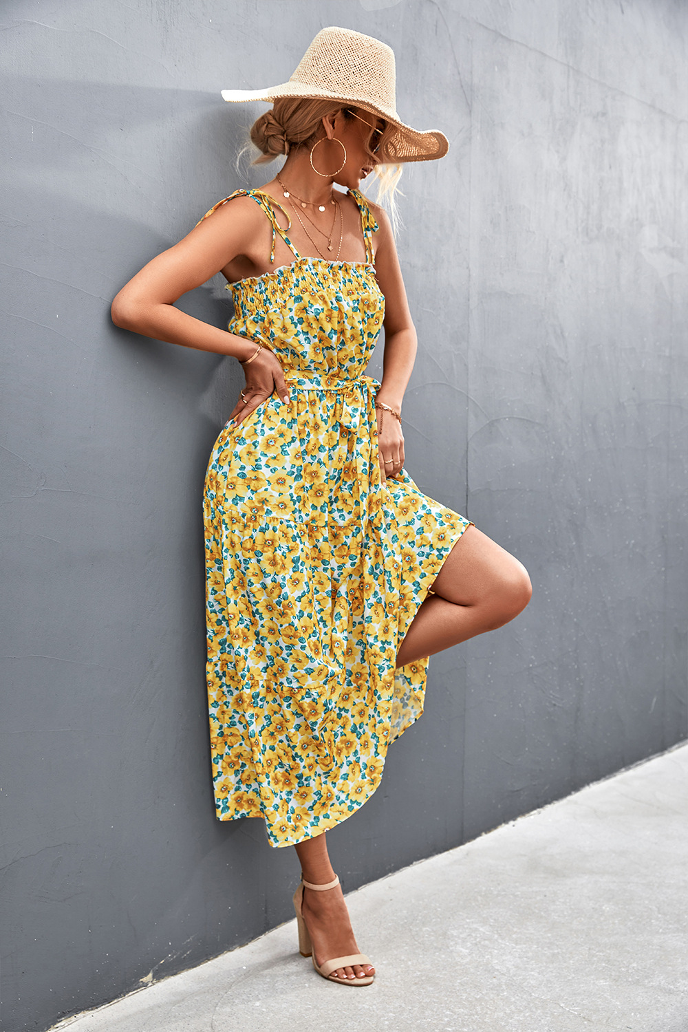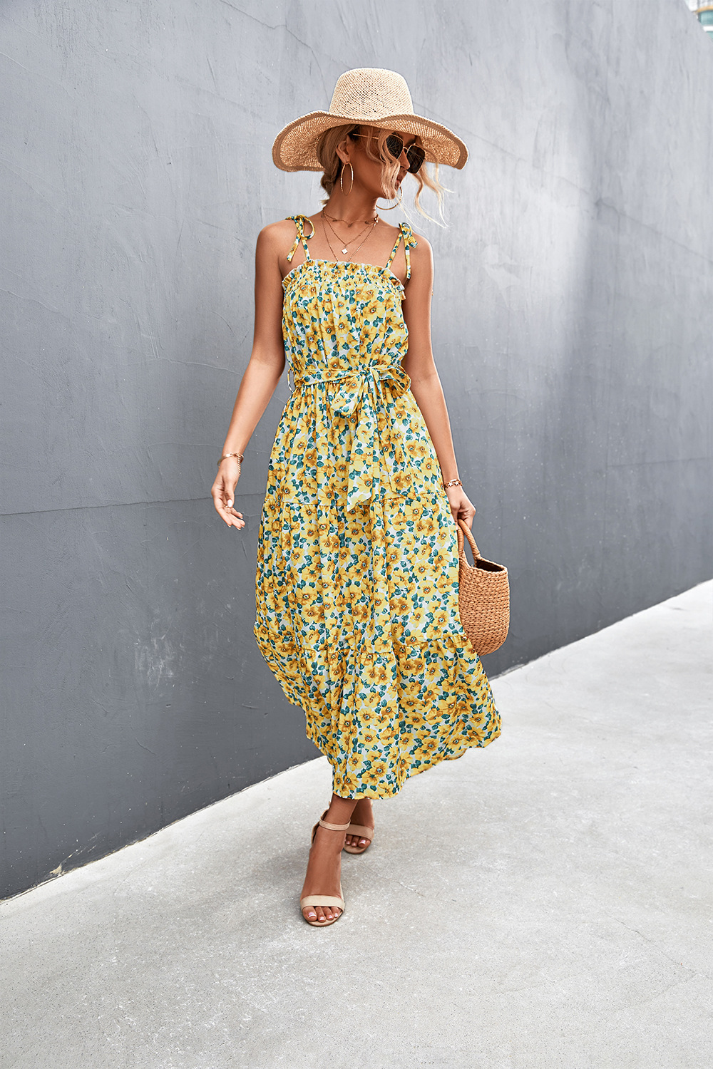 Spring Summer Sling Pocket Pleating Floral Mid Length Dress Women With Belted