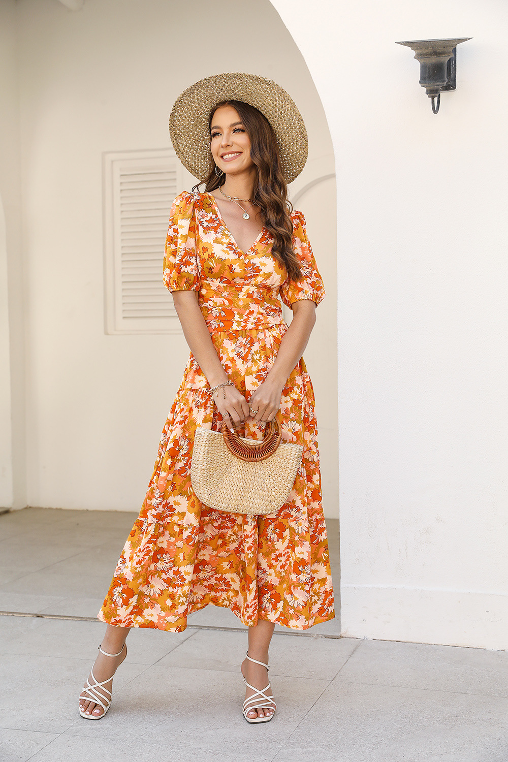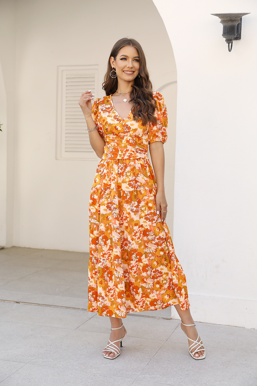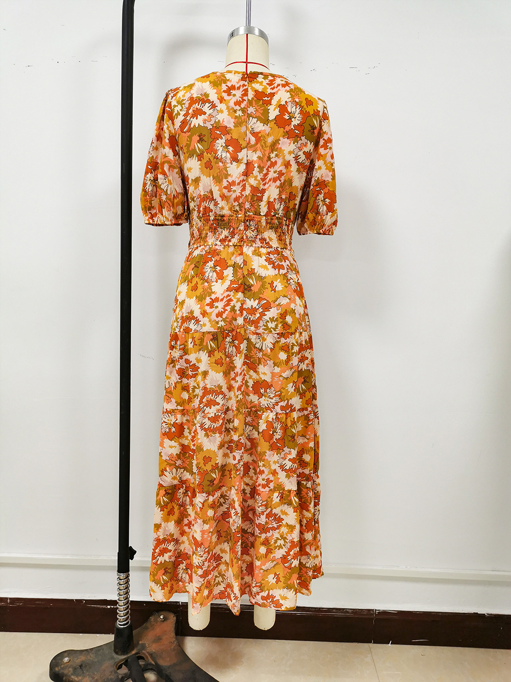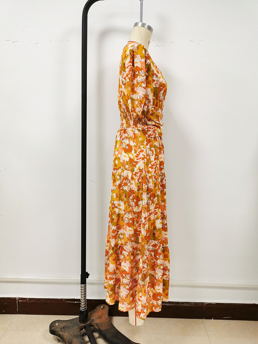 Be the first to review “Spring Summer V Neck Short Sleeve Yellow Waist Slimming Printed Maxi Dress”