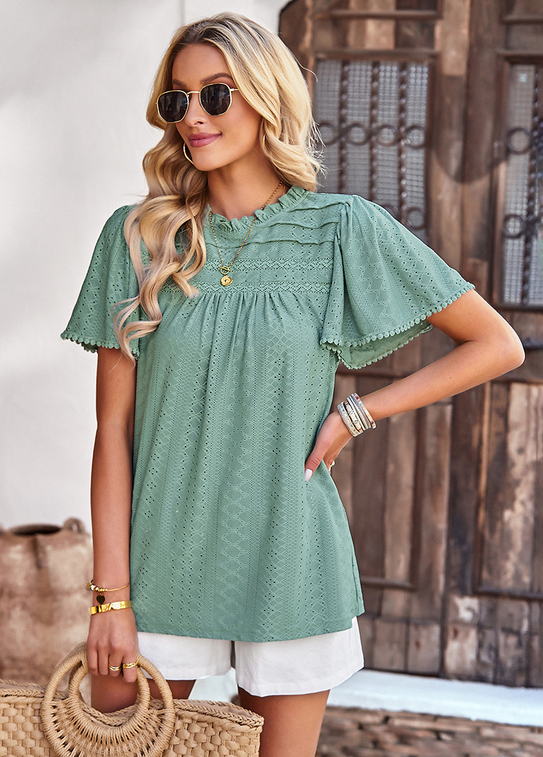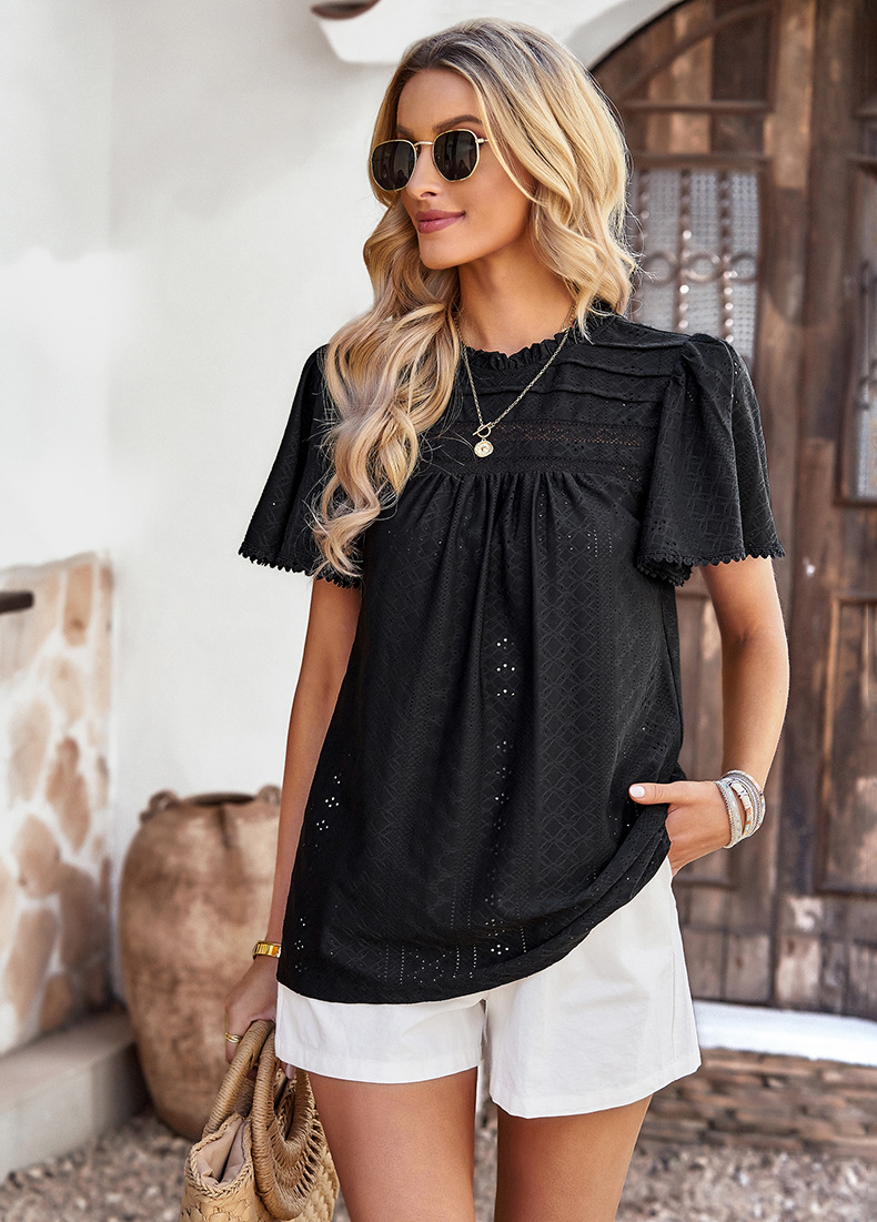 Summer Casual Solid Color Hollow Out Cutout Short Sleeve round Neck Top